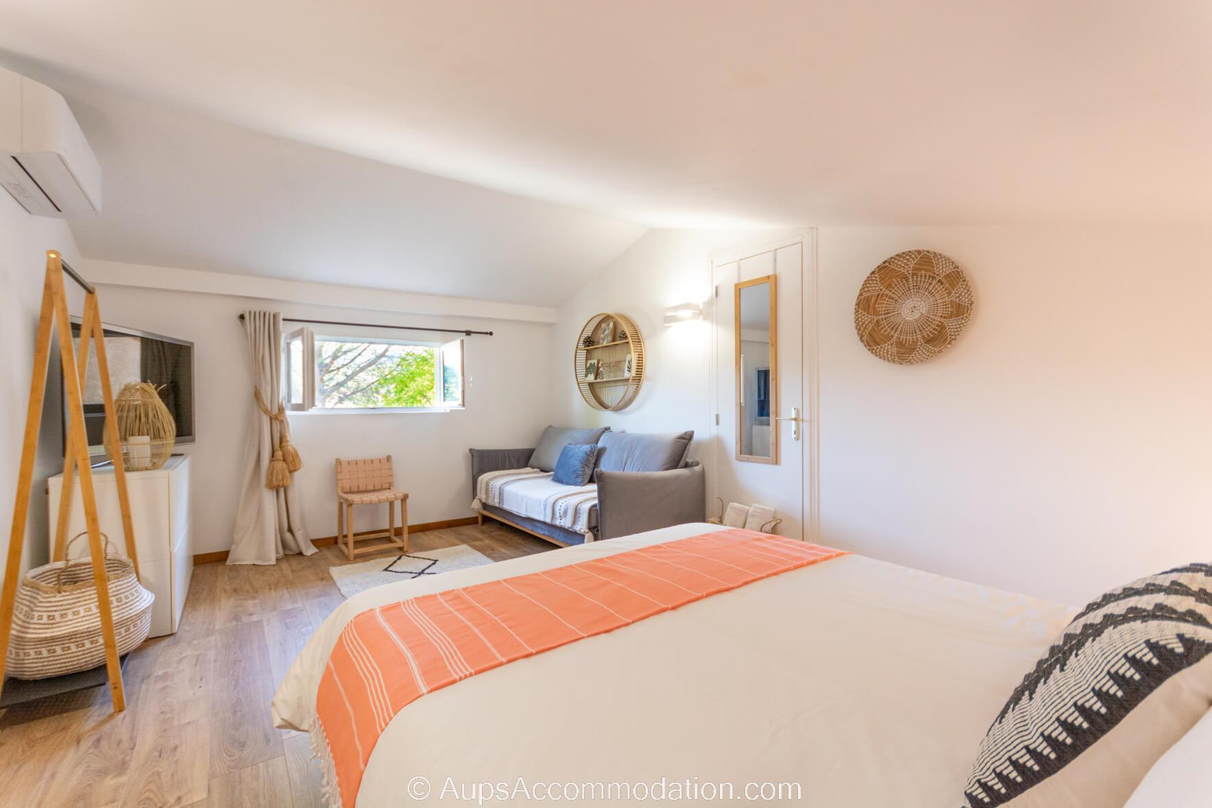 La troisième chambre est également située au premier étage. Cette chambre de style loft dégage une atmosphère moderne et peut être utilisée comme une suite spacieuse avec un lit king-size et un coin salon avec télévision, ou pour plus de flexibilité, le canapé-lit peut être transformé en lit double. Les vues donnent vers le jardin et la campagne environnante.