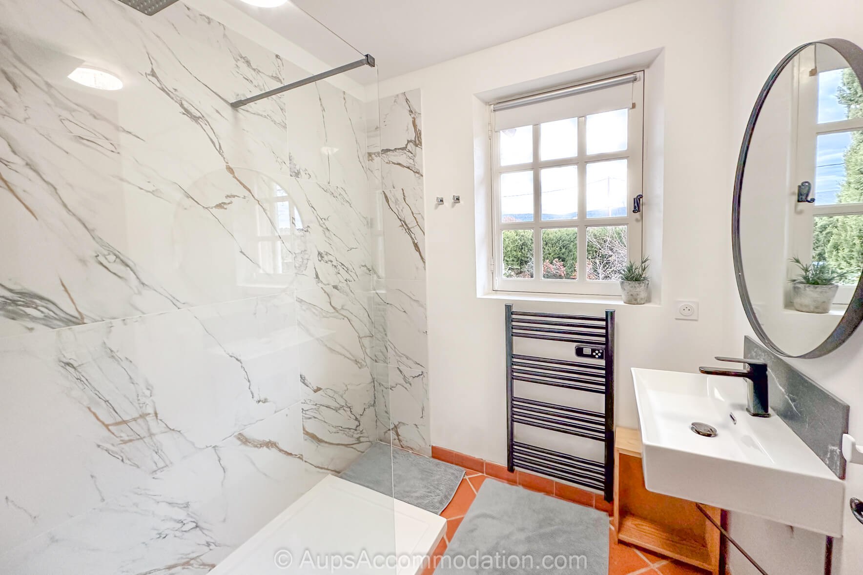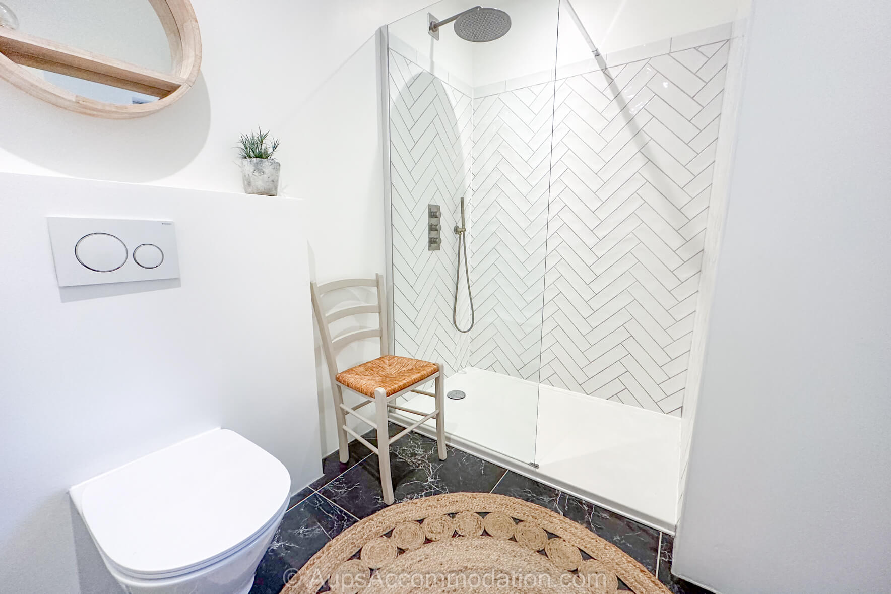 En face se trouve une salle d'eau familiale avec grande douche à l'italienne et lavabo. Les carreaux contemporains effet marbre avec des raccords noirs ajoutent encore au style moderne. Un WC avec lavabo se trouve juste à côté.