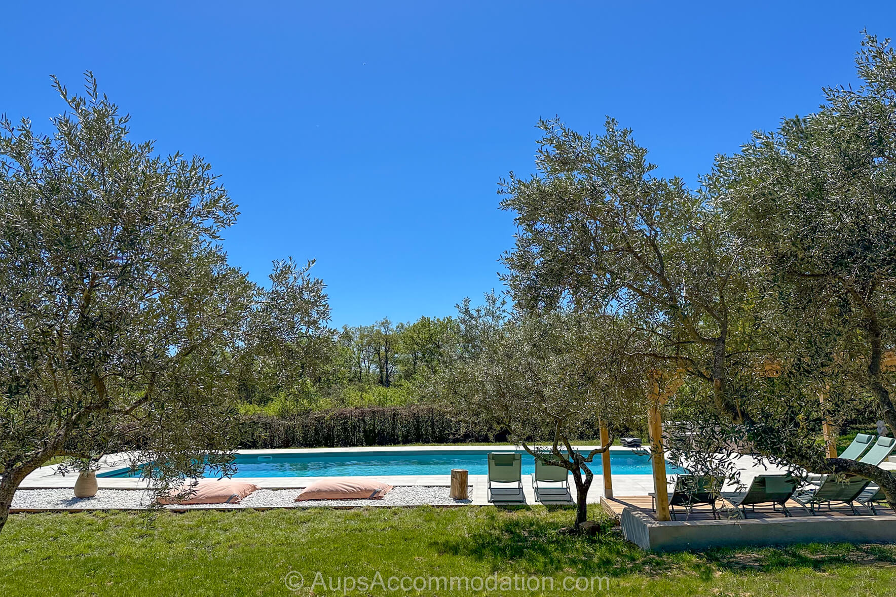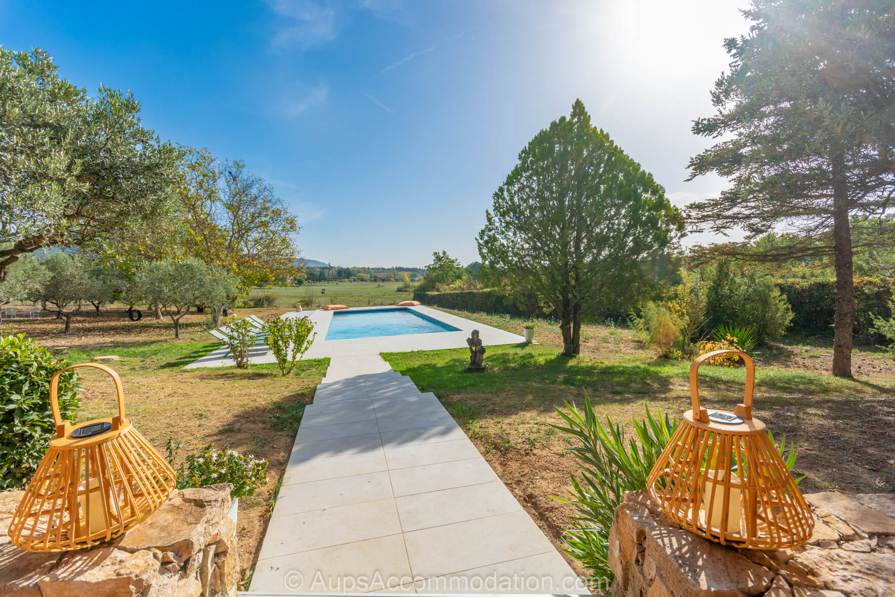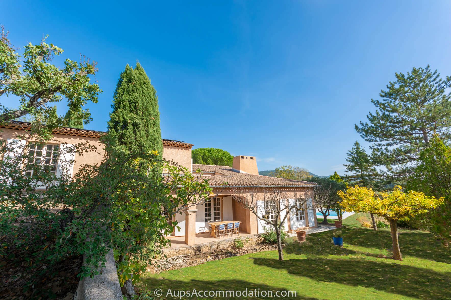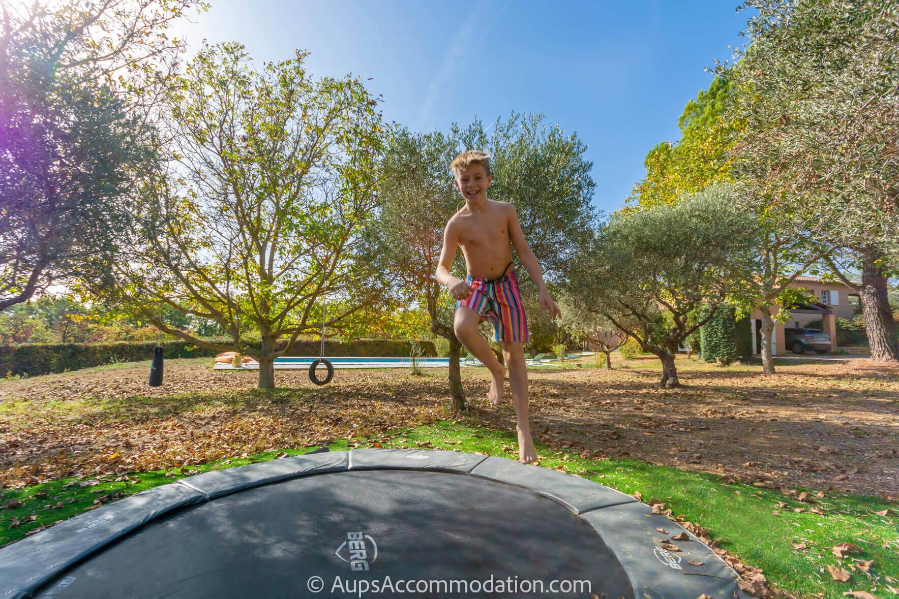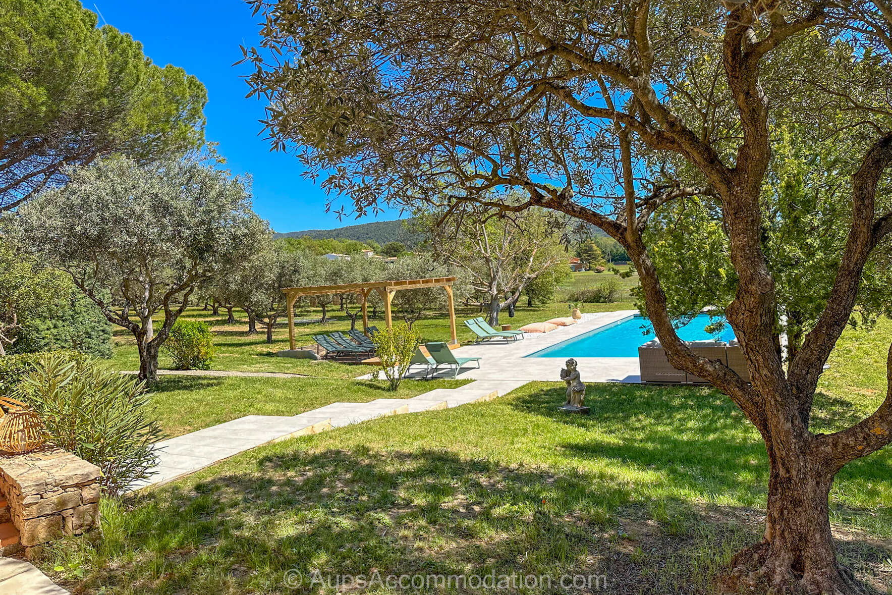 Pénétrez dans le domaine du Mas, Aups par des portes électriques sécurisées, et vous êtes immédiatement accueilli par le vaste terrain privé clos de 5000 m² et une vue imprenable sur la campagne. Le terrain entoure la propriété dans son intégralité et possède sa propre oliveraie de plus de 60 arbres, ainsi que des arbres fruitiers tels que figuiers, pommiers et cognassiers. Le long de l'oliveraie se trouve la piscine de 15 m x 5 m, plus un trampoline enterré et « l’arbre de jeu », un grand arbre à grimper avec une balançoire en corde, table de ping pong. un sac de frappe et une balançoire en pneu. (Veuillez noter que ces équipements doivent être utilisés sous surveillance et à vos propres risques). La piscine a une partie profonde et une partie peu profonde, ainsi que, pour votre sécurité, une couverture rigide roulante électrique.