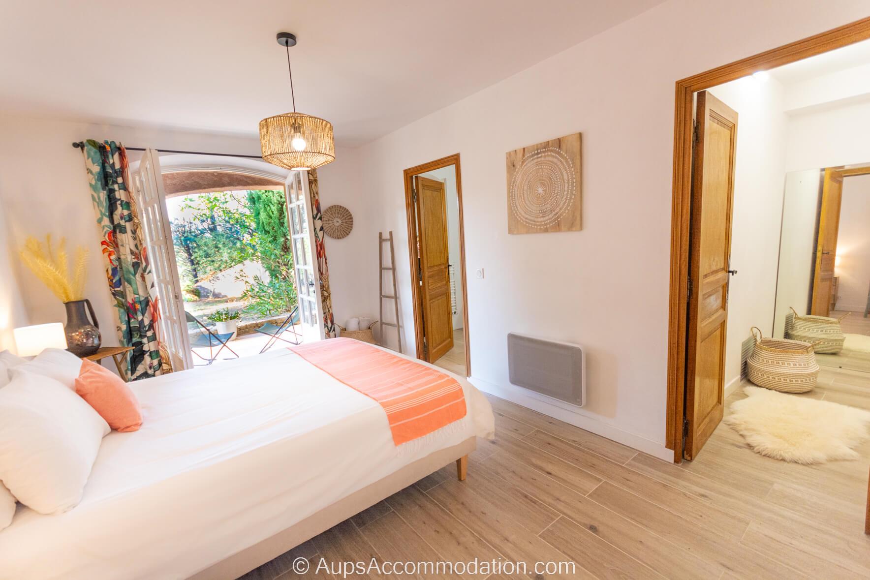 La première chambre principale située au rez-de-chaussée est une spacieuse suite king. De nombreux dressings et espaces de rangement sont proposés dans le dressing, et la chambre bénéficie d'une salle de bain attenante avec une baignoire îlot moderne, une douche à l'italienne, des WC et un lavabo. Les vues par les doubles portes donnent sur les jardins clos, arbres fruitiers et, terrasses aménagées.