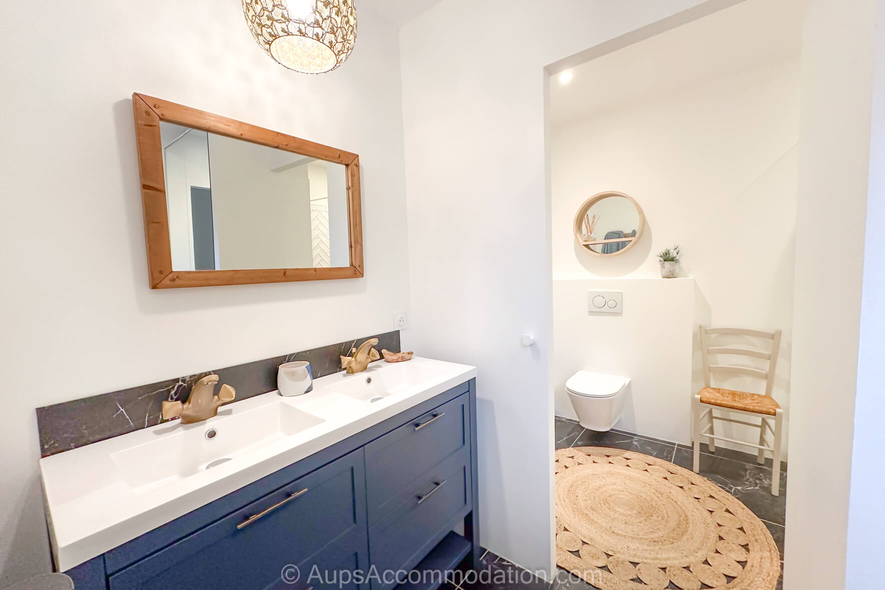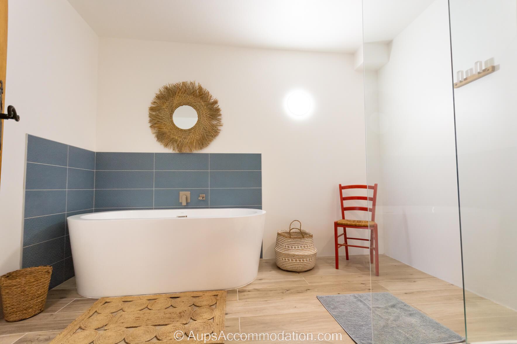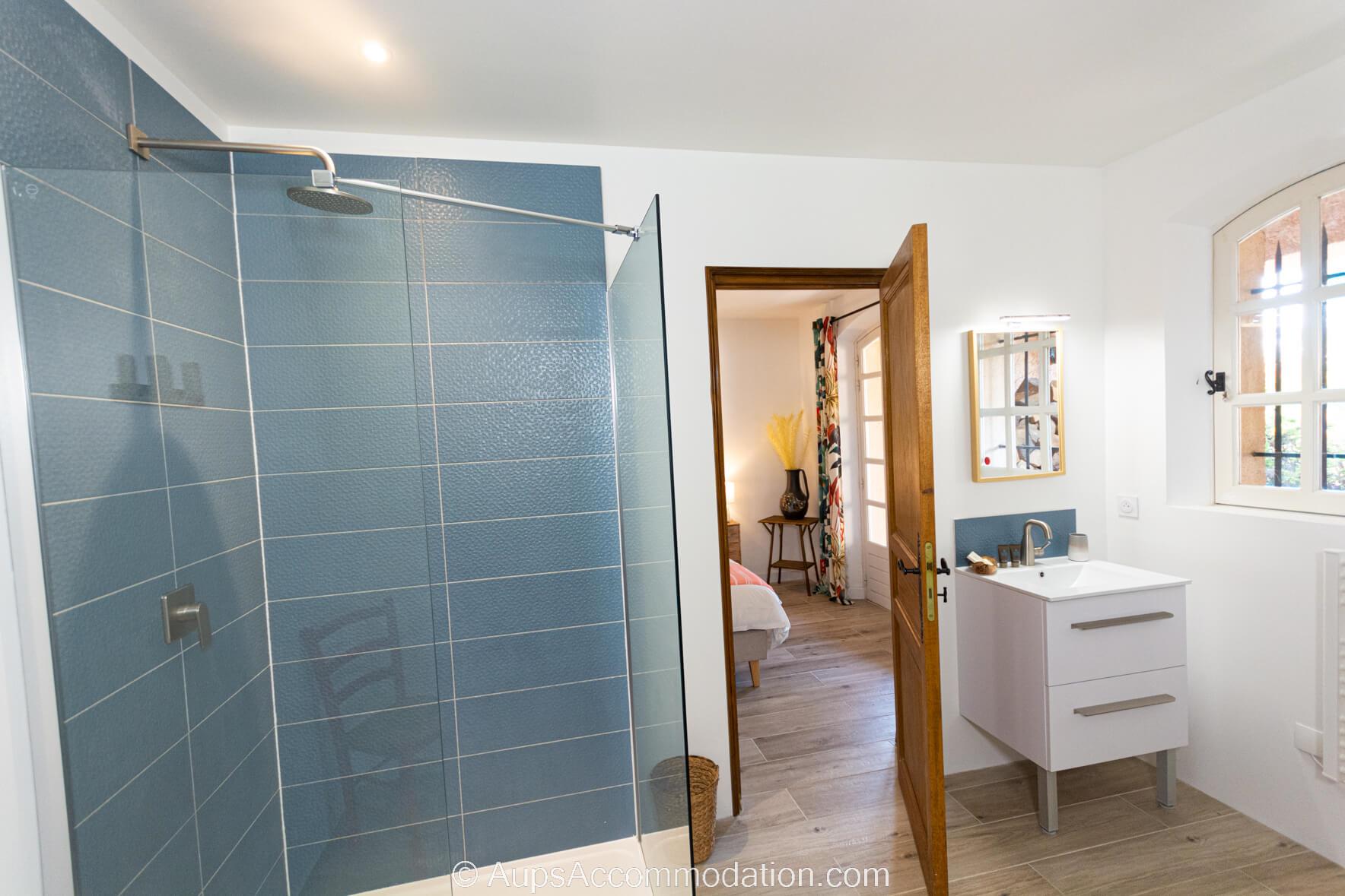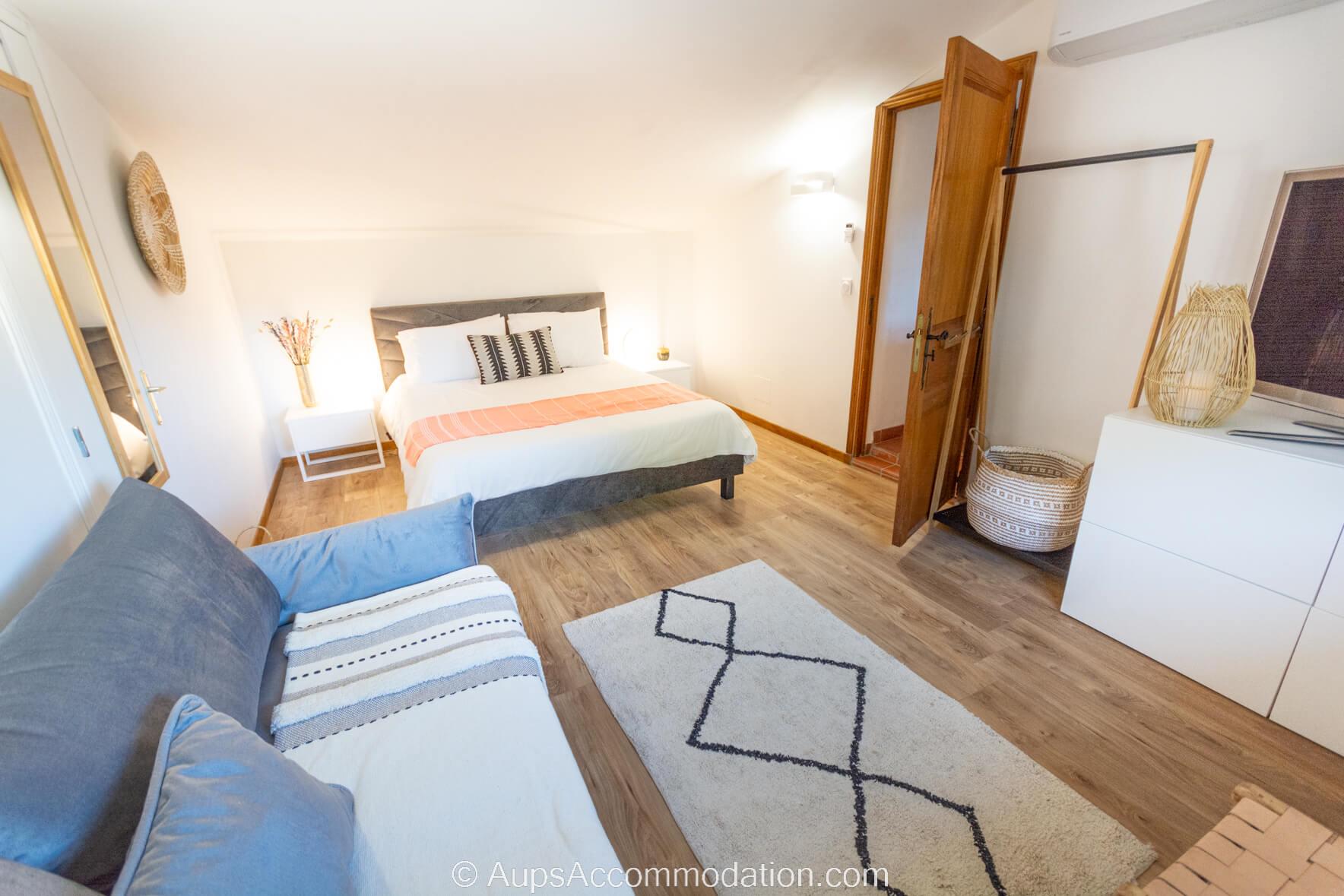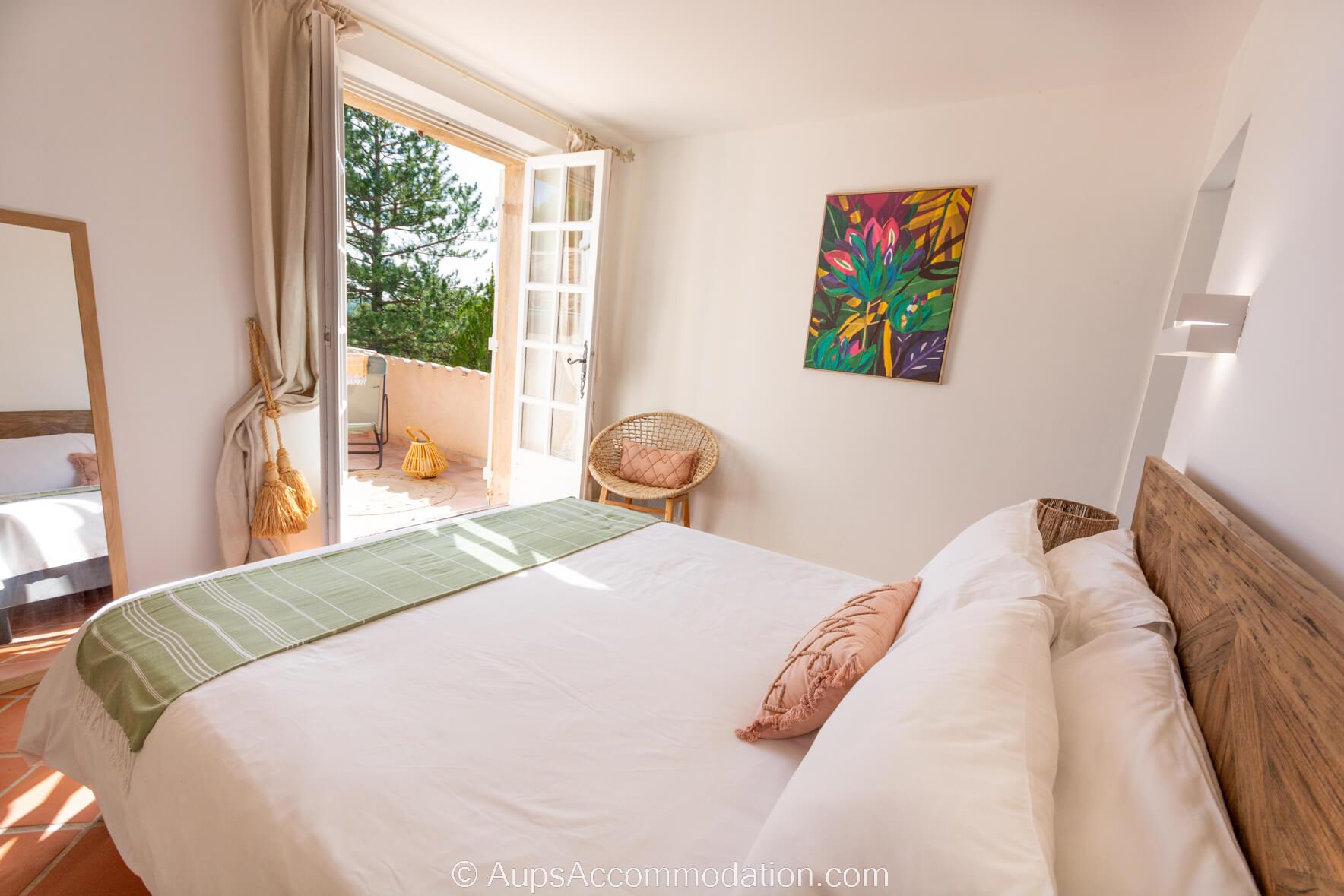 La deuxième chambre principale est située au premier étage. Encore une fois, il s’agit d’une chambre spacieuse, joliment meublée avec des meubles en bois de qualité et offrant sa propre terrasse ensoleillée et privée sur le toit avec de superbes vues provençales. Mettez-vous à l’aise dans votre dressing avec ses miroirs du sol au plafond et de nombreux rangements pour les vêtements, jusqu'au double lavabo avec raccords en laiton traditionnels. En sortie du dressing se trouve une grande douche privée et un WC.
