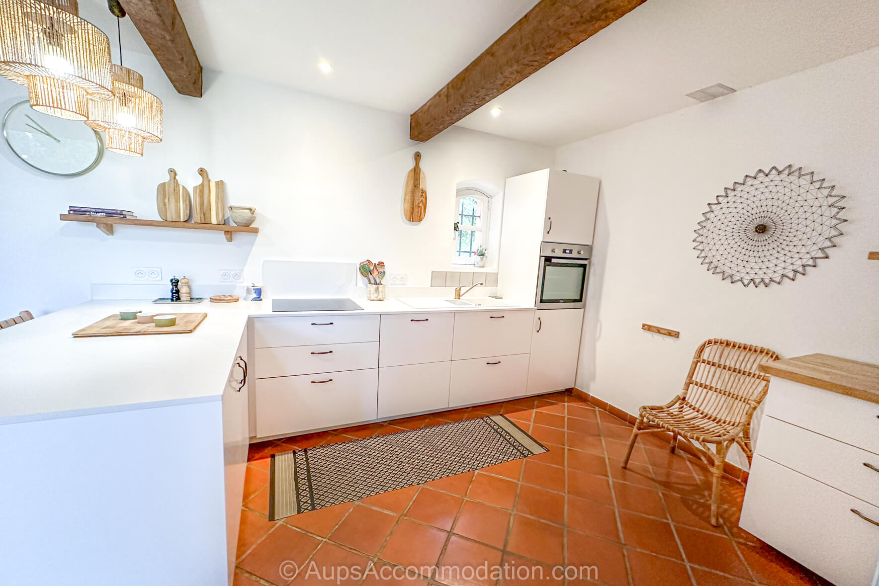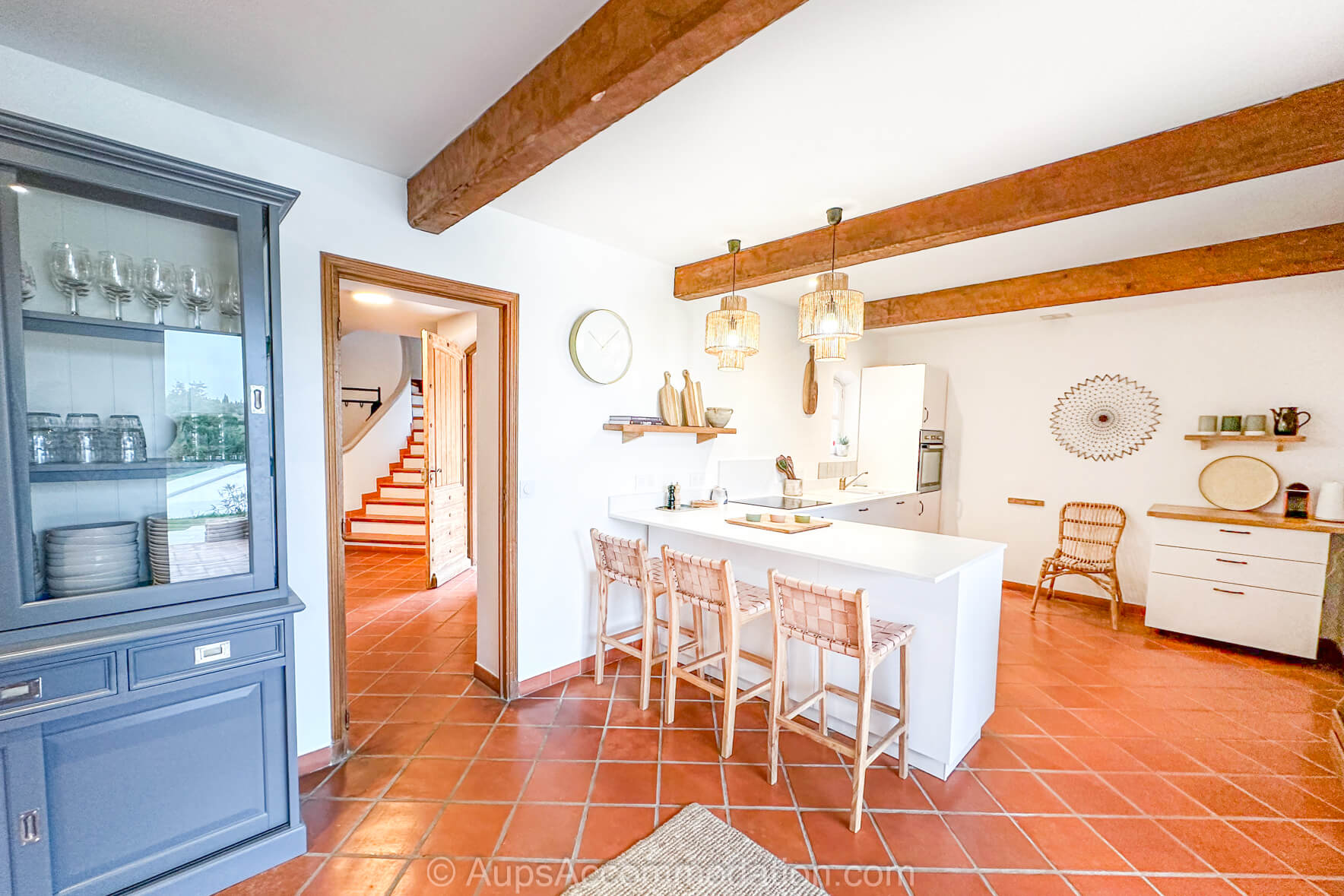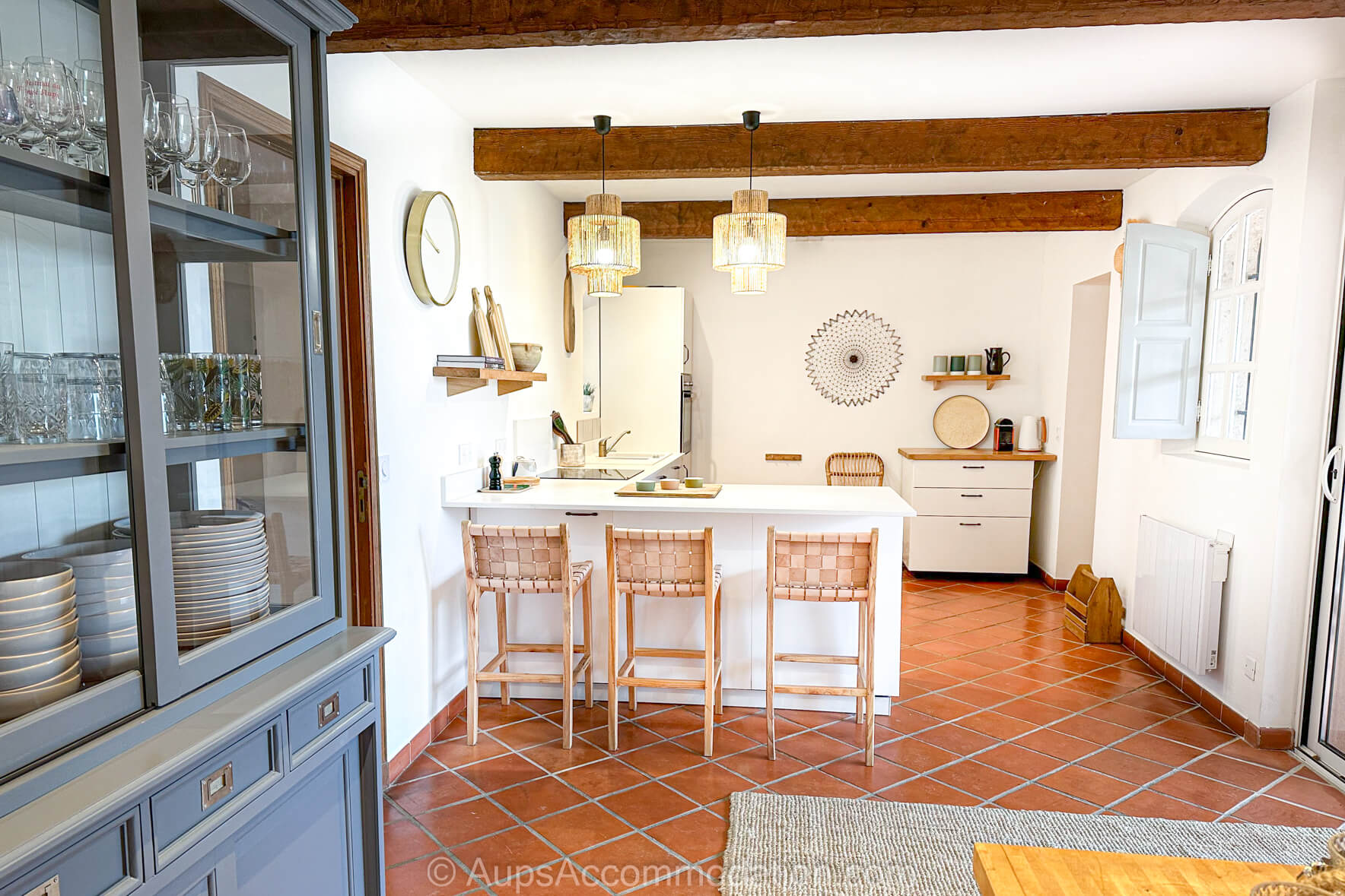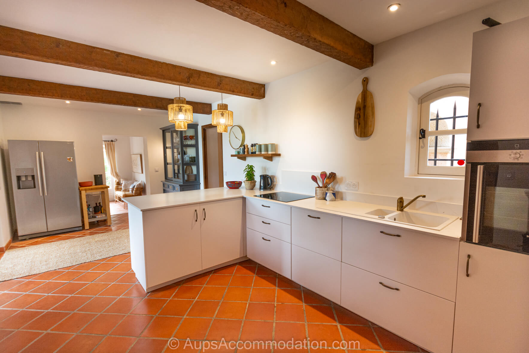 Lorsque vous entrez dans la propriété par l'arche traditionnelle, vous êtes immédiatement plongé en Provence, avec des meubles et des accessoires d'origine locale et de nombreuses fenêtres cintrées encadrant la vue sur le jardin. En regardant vers la cuisine, les unités modernes offrent un grand espace de rangement et les surfaces de travail en pierre de quartz donnent une sensation de fraîcheur élégante. Équipée d'un réfrigérateur congélateur de style américain (plus un deuxième réfrigérateur congélateur dans le garage), lave-vaisselle, plaques de cuisson, four, bouilloire, grille-pain, machine Nespresso, micro-ondes et de nombreux équipements de cuisine pour les groupes. Si vous préférez cuisiner à l'extérieur, vous trouverez un barbecue de style cheminée sur la terrasse juste à l'extérieur de la cuisine. Les portes coulissantes doubles de la cuisine ouvrent sur une vue imprenable et sur la grande terrasse aménagée ainsi que sur le terrain avec son impressionnante piscine de 15m x 5m. Les propriétés locatives avec de si grandes piscines sont difficiles à trouver, non seulement vous pouvez nager de longues distances si vous êtes un nageur passionné, mais les grands groupes peuvent également trouver beaucoup d'espace pour leurs accessoires gonflables et leurs jeux ! La piscine est entourée de plus de 80m² de terrasse carrelée antidérapante pour offrir beaucoup d'espace et des spots gorgés de soleil toute la journée. Veuillez noter qu'il y a une extrémité profonde et une peu profonde dans la piscine, plus pour votre sécurité, une couverture de sécurité électrique rigide. La piscine est chauffée et ouverte des vacances de Pâques d'avril à fin octobre.