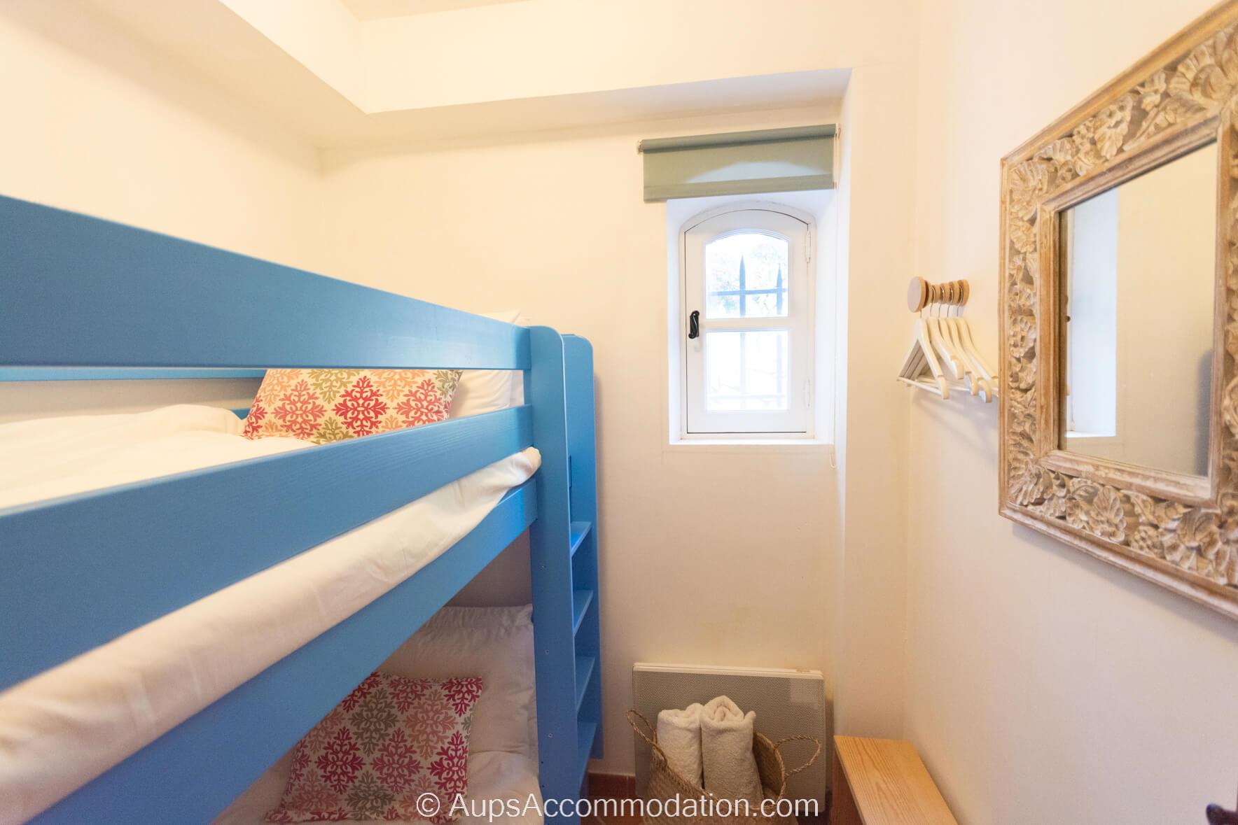 La cinquième chambre est située au niveau inférieur à côté de la chambre 1. Il s'agit d'une petite chambre avec lits superposés, avec une grande baie vitrée offrant une vue sur les jardins. Il y a des crochets suspendus et un grand tiroir sous le lit, et le couloir adjacent offre d'autres suspensions et une commode. Juste à côté se trouve un WC avec lavabo. La chambre est mieux adaptée pour 1 personne en raison de sa taille, mais il est possible d’y loger 2 enfants s'ils ne craignent d’être un peu à l’étroit. Un ventilateur est disponible.