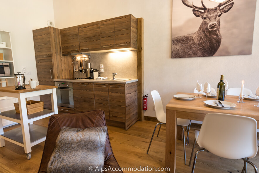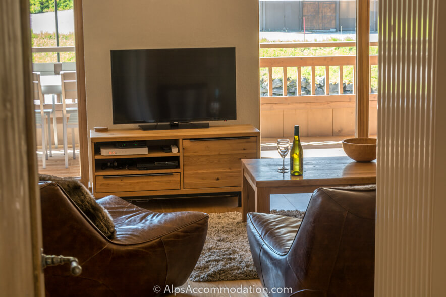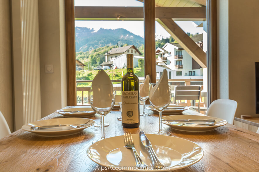 Une grande table disposée en dessous du tableau d’un cerf, et d’une belle lampe suspendue pourra accueillir jusqu’à 6 personnes. Cet espace offre un point de vue excellent sur les pistes du Grand Massif à travers les grandes baies vitrées.