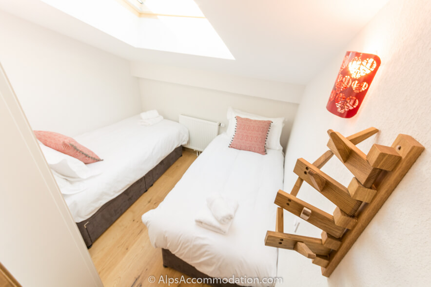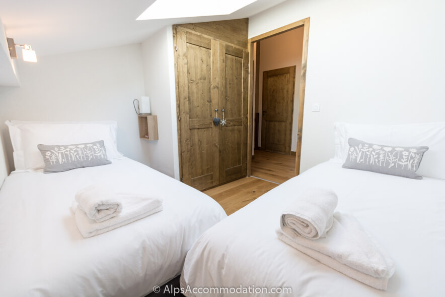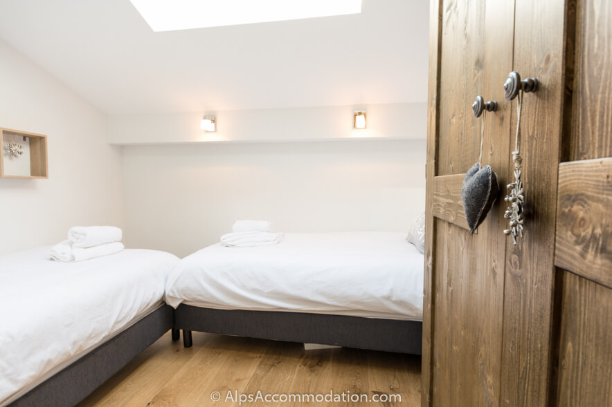 La chambre 2 est une sympathique chambre à lits jumeaux disposant d’un velux avec store occultant, qui offre une ambiance fraiche et agréable. L’armoire comprend un large espace de rangement et suspension.