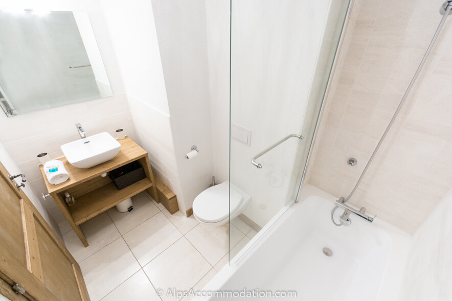 L’appartement dispose de 2 salles de bain familiales modernes, disposées de chaque côté des trois chambres. La première est équipée d’une baignoire de taille standard avec douche intégrée, d’un meuble lavabo, sèche-serviette chauffant et d’un WC. Dans la seconde salle de bain, on trouve une grande douche, un meuble lavabo et un sèche-serviette chauffant. Il y a également un WC supplémentaire indépendant avec lavabo.