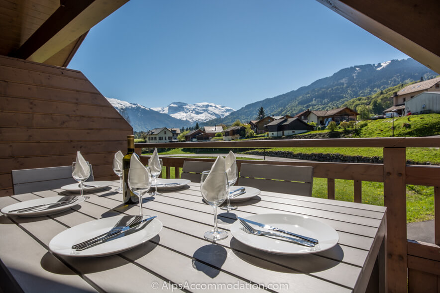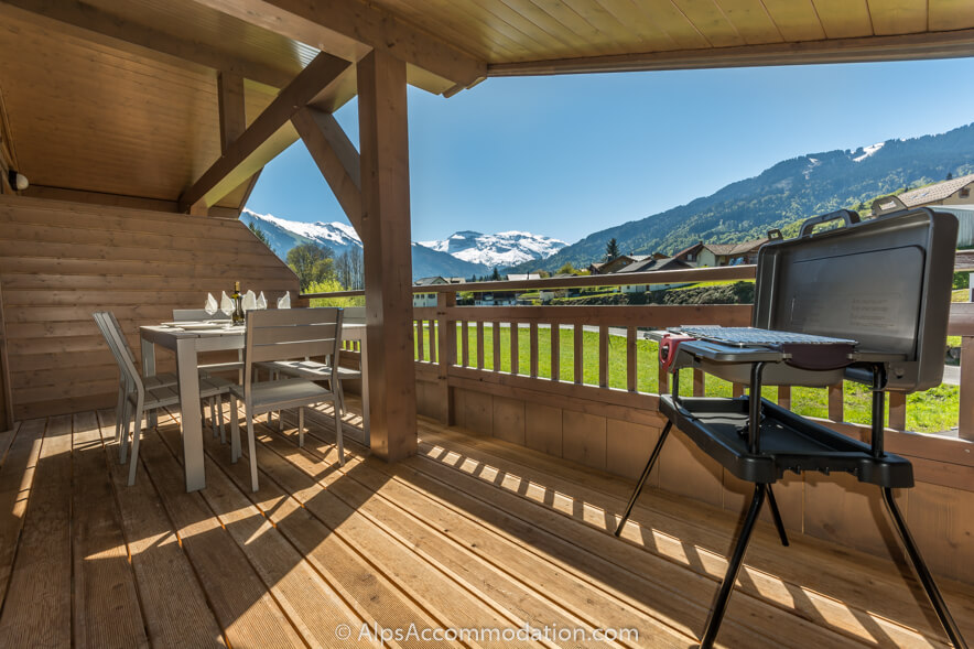 L’appartement bénéficie d’un superbe balcon de 14m2 exposé plein-sud, offrant un impressionnant panorama sur la montagne du Criou qui surplombe Samoëns, tout autour jusqu’aux pistes enneigées du Grand Massif. Son exposition sud vous assurera un ensoleillement tout au long de la journée et un point de vue parfait pour profiter des levers et coucher de soleil. Le balcon dispose d’une table et chaises d’extérieur ainsi que d’un barbecue électrique. L’appartement est entouré d’un jardin communal plat.