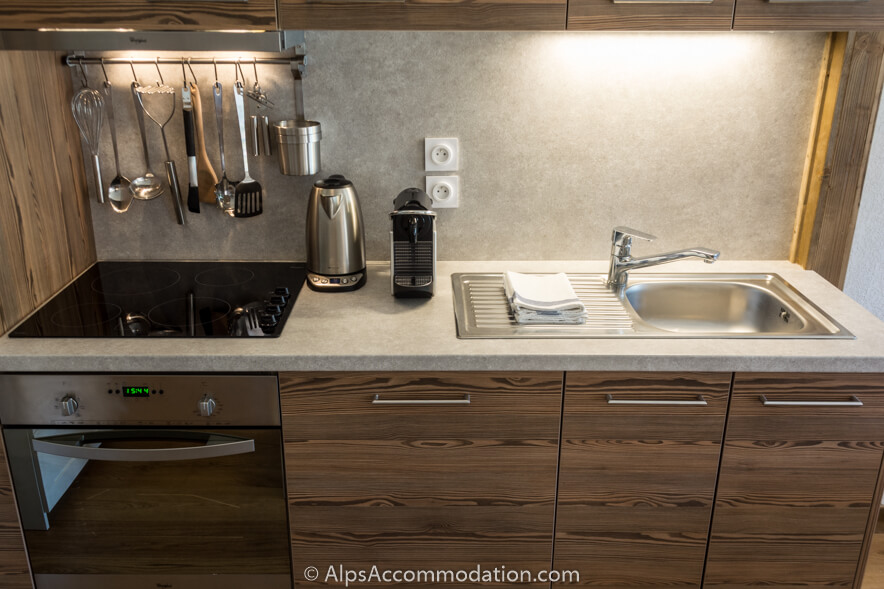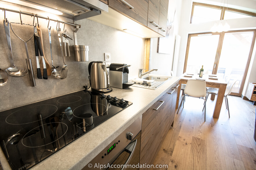 A votre gauche, vous trouverez une cuisine tout-équipée comprenant four électrique de taille standard, 4 plaques de cuisson, micro-onde, lave-vaisselle, et machine à café Nespresso. Un ilot central offre une surface de préparation supplémentaire ainsi que du rangement.