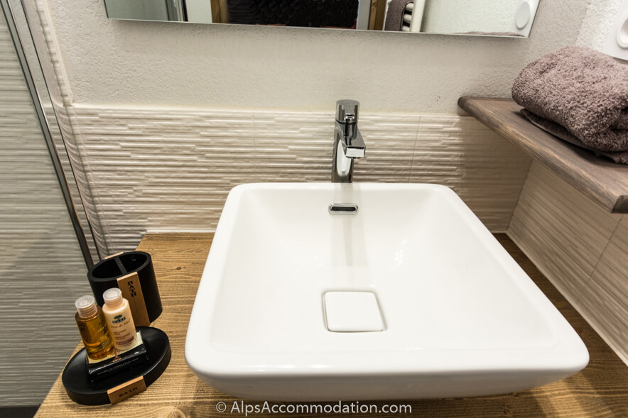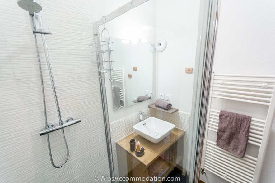 La salle de bain familiale, élégante et contemporaine, se compose d’une grande douche, d’un meuble lavabo et d’un sèche-serviettes électrique. Un WC séparé se situe à côté de la salle de bain.