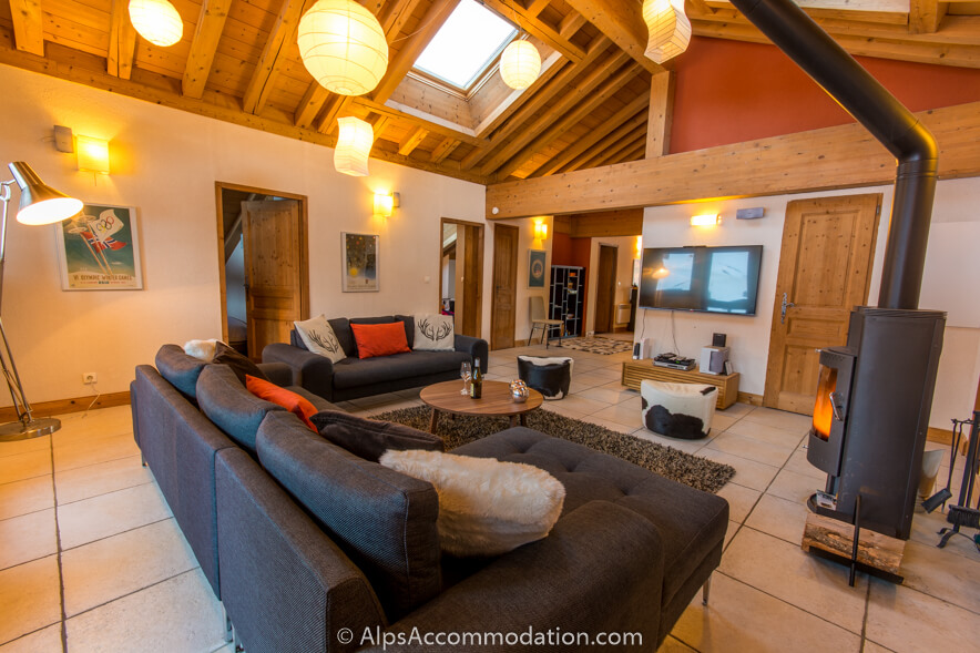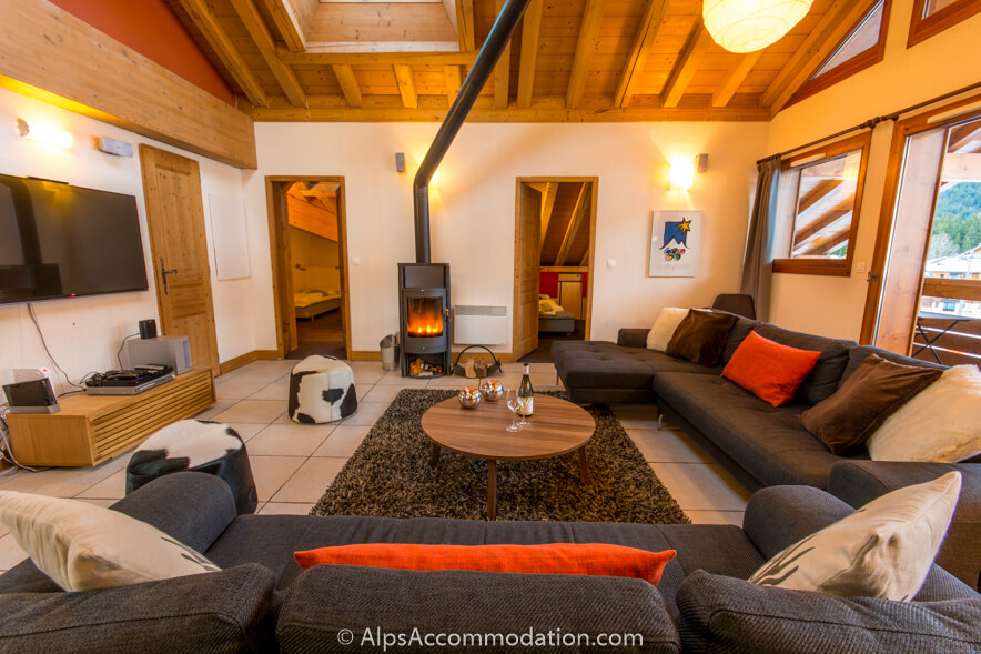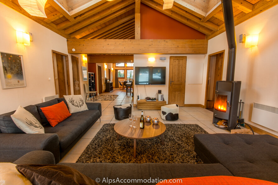 Le salon de l’appartement comprend une cheminée à bois, et 2 grand canapés. Son plafond à double hauteur, et ses grandes fenêtres donnent une atmosphère lumineuse et spacieuse. Il y a une vue extraordinaire de ses deux grands balcons dont l’un donne directement sur les pistes et les pics des montagnes environanantes.