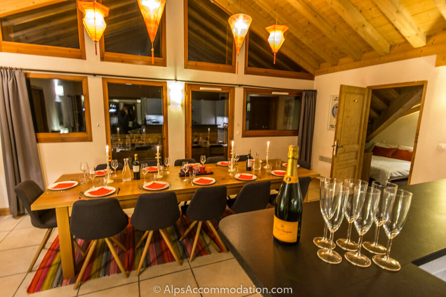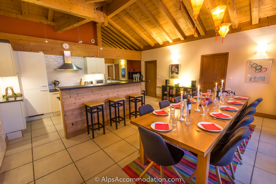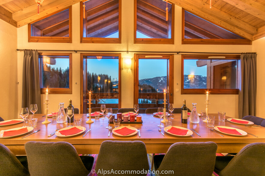 L’espace salle-à-manger possède une très belle table en chêne pour recevoir 14 personnes. Dans cet espace, les portes-fenêtres s’ouvrent sur un second balcon avec vues extraordinaires et magiques sur les sommets et la fôret.