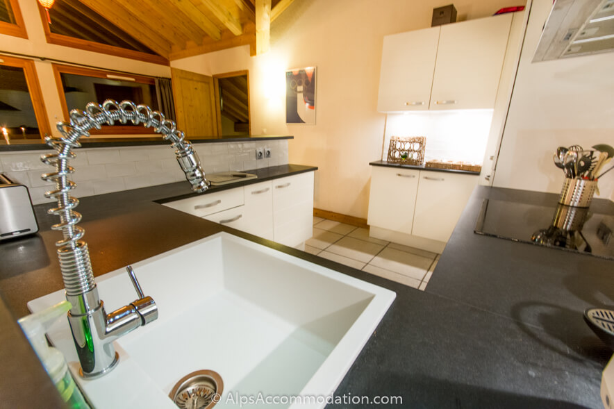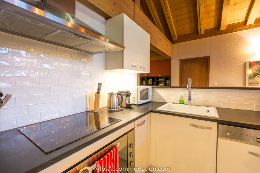 L’espace cuisine est équipé de grands plans de travail, d’une plaque chauffante vitrocéramique à 4 feux, d’un grand four, d’un lave vaisselle, d’un grand frigo-congélateur et d’un four micro-ondes plus des set à raclette et crepes, une machine a cafe Nespresso et une mijoteuse. Le nécessaire de cuisine et la vaisselle sont adaptés à la capacité d’accueil de l’appartement.
