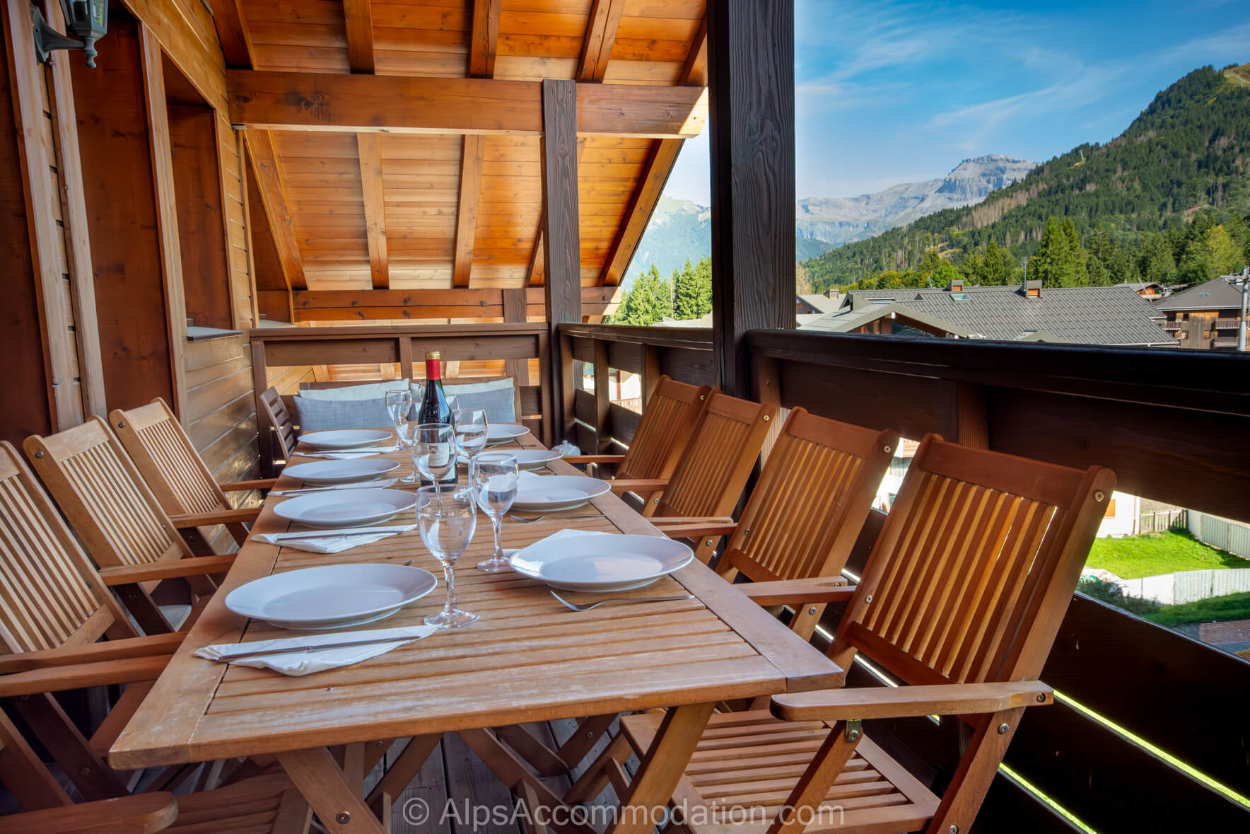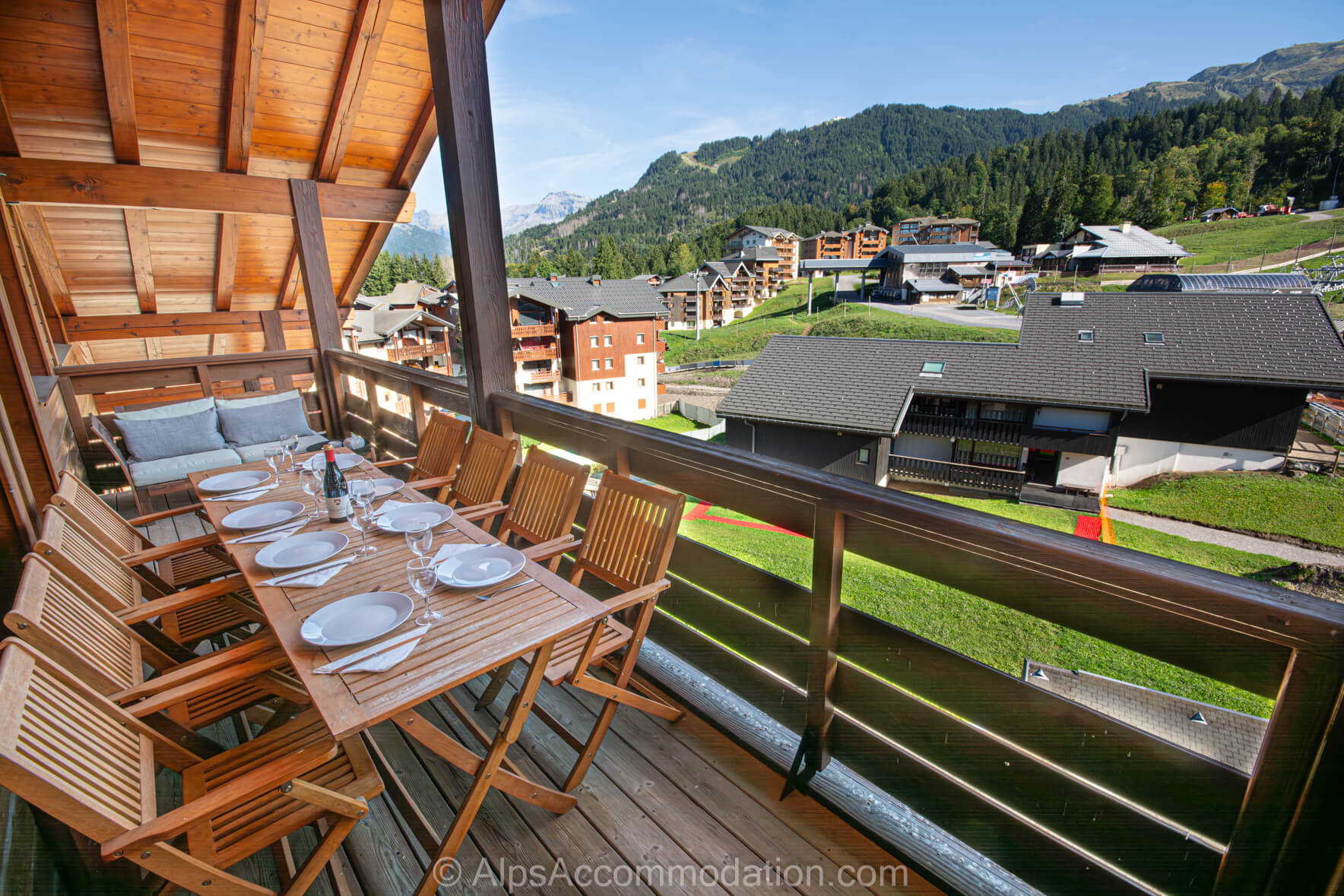 Le salon donne accèe au balcon de l’appartement, côté Sud, offrant des vues étonnantes sur les montagnes. Ce balcon est équipé d'un mobilier d’exterieur – très agréable si on prend les apéros après-ski ou les petits repas dehors.