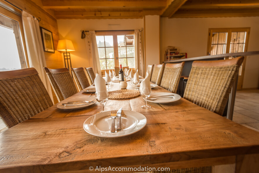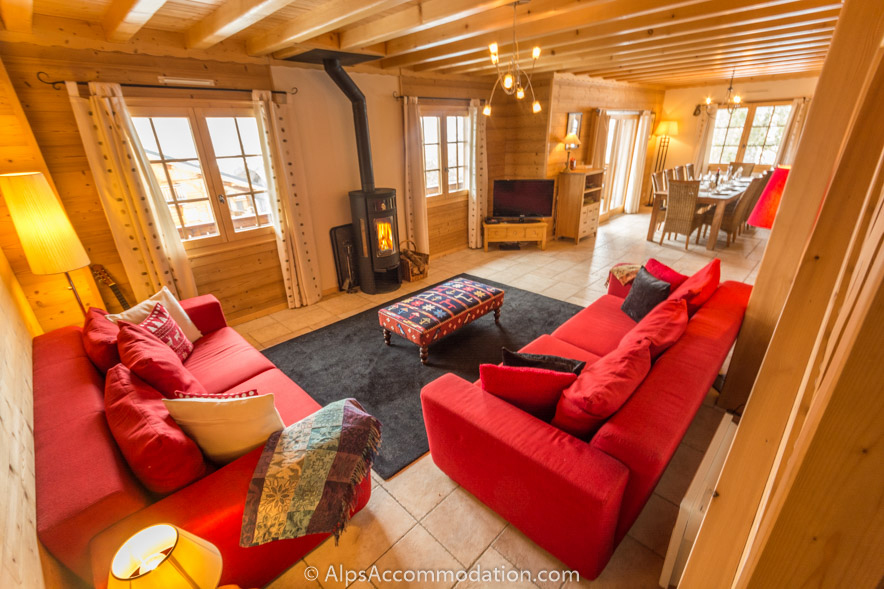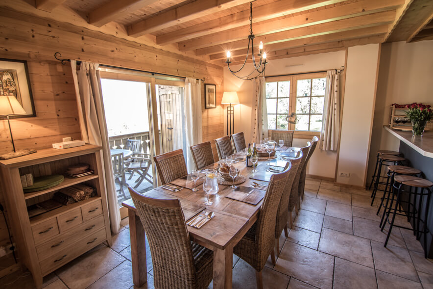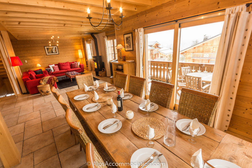 Les détails de la décoration, et l’ameublement du séjour spacieux et lumineux à plan ouvert, comprenant le salon, la salle à manger et la cuisine, sont d’un très haut standing dans une ambiance accueillante. Apres une journée dans la montagne on peut se reposer dans deux sofas profonds et confortables autour d’un foyer à buches. En face, la partie salle a manger peut facilement accueillir jusqu’a douze personnes. A travers les grandes portes-fenêtres, on peut admirer la vue exceptionnelle sur la vallée.