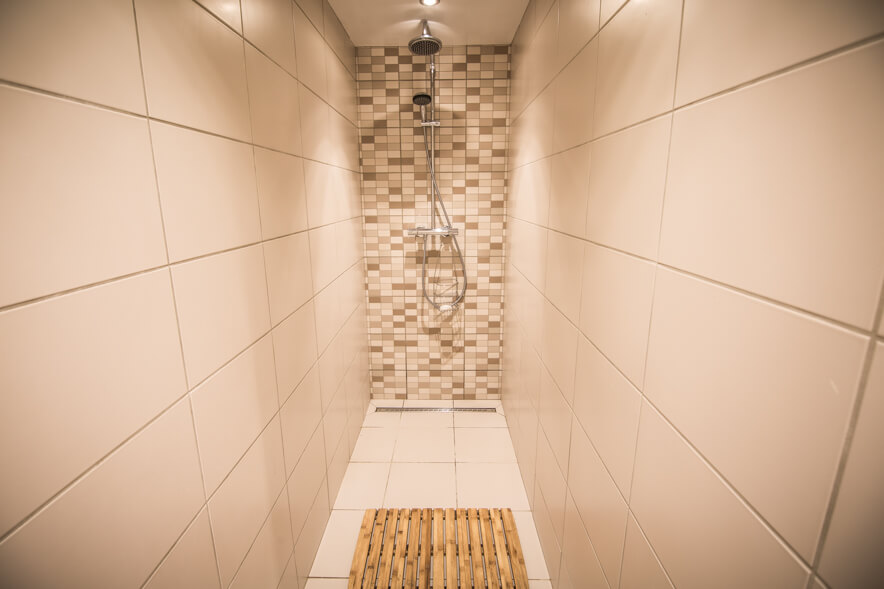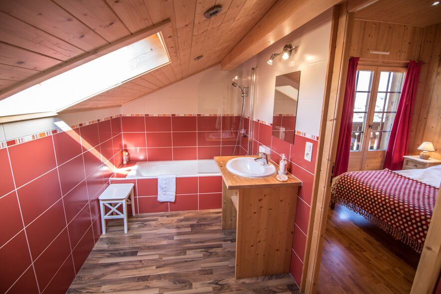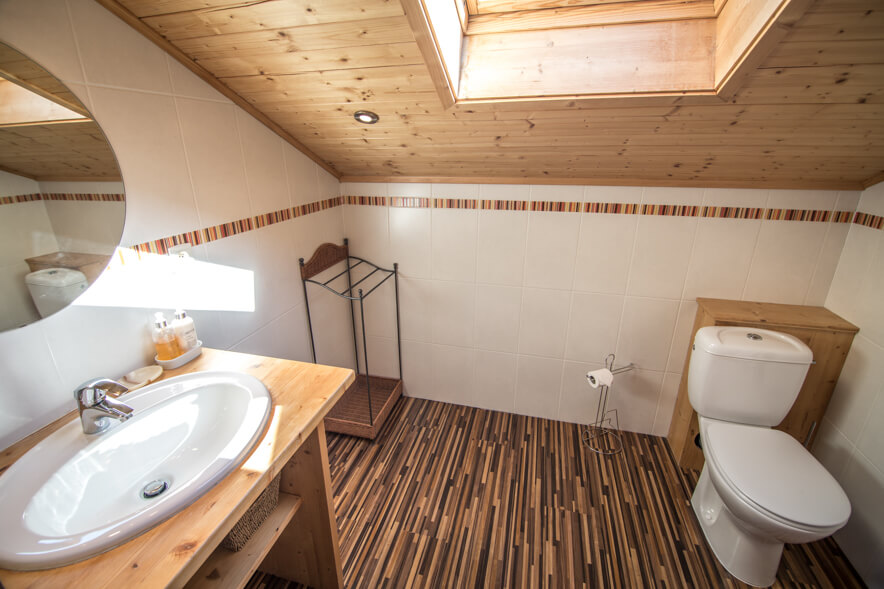 Au rez-de-chaussée, se trouve la première chambre avec sa salle-de-bain privée équipée d’une baignoire avec douche intégrée, un lavabo et des WC.