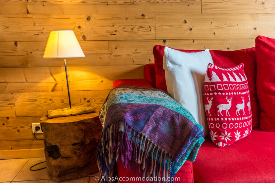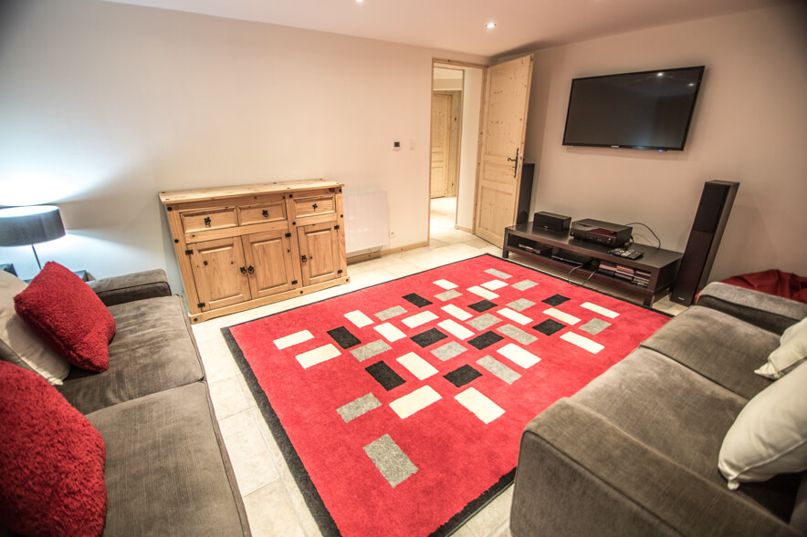 La salle du cinema/snug possède un canapé-lit double, très confortable. Dans ce chalet luxueux, des produits de toilette, des robes de chambre et des mules sont à la disposition des clients.