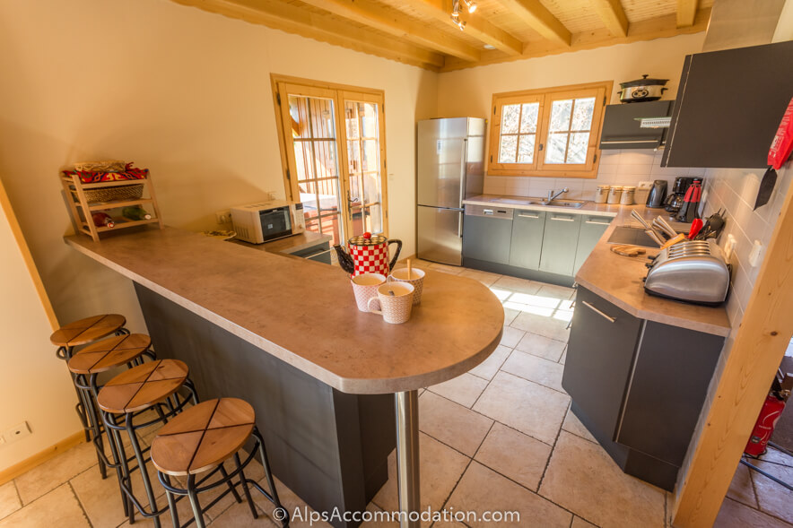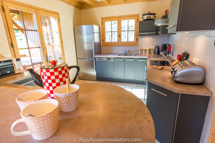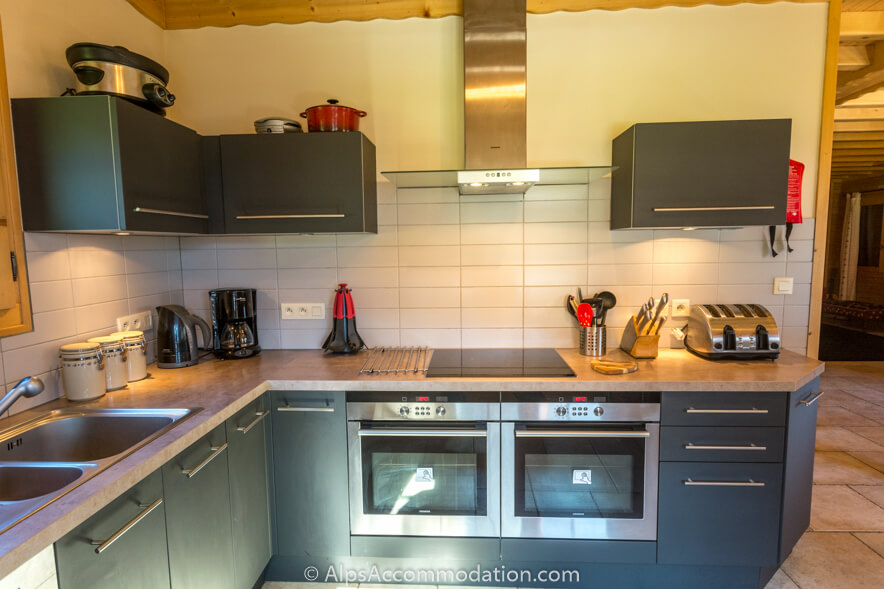 La cuisine spacieuse, toute équipée moderne, est idéale pour préparer de bons repas. Elle comprend deux grands fours et une plaque de cuisson électrique, un four a micro-ondes, un lave-vaisselle, une machine à café électrique, et des grands plans de travail.