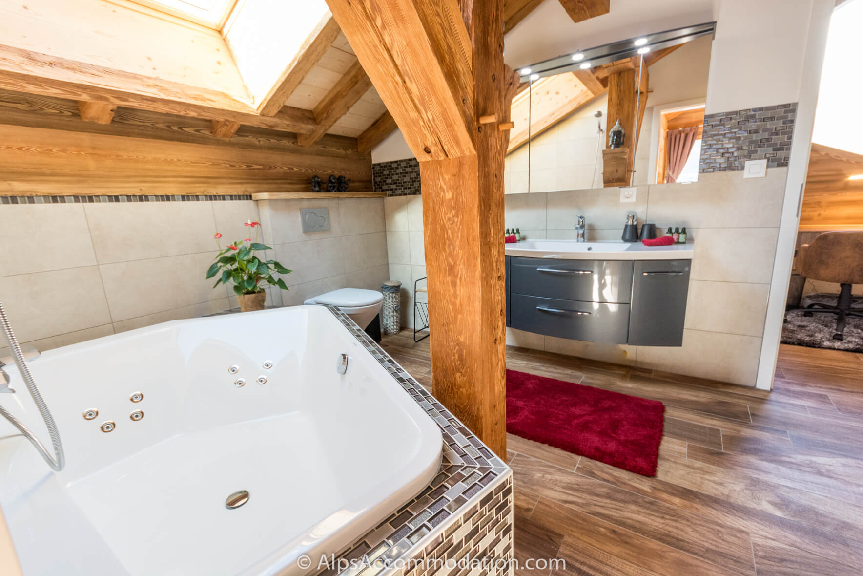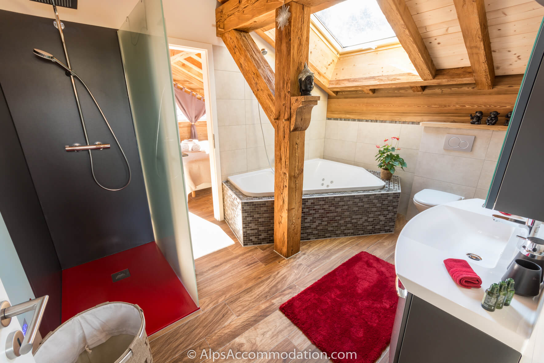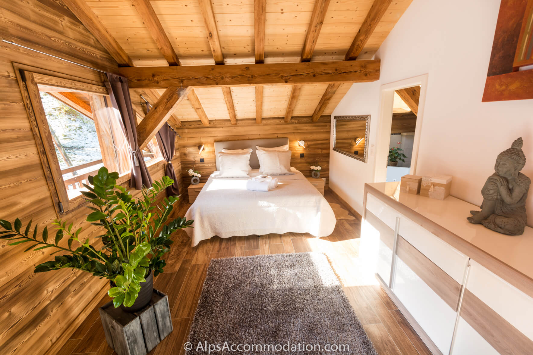 La chambre 1, chambre principale, est située à l'étage supérieur du chalet. Cette chambre spacieuse et lumineuse dispose d'un magnifique lit super King size et d'une superbe salle de bain privée avec douche à l'italienne, baignoire à remous/jacuzzi pour 2 personnes, WC et lavabo avec meuble sous vasque. Cette chambre dispose également d'un balcon privé, orienté plein sud, équipé d'une table et de chaises et d'une chaise longue.