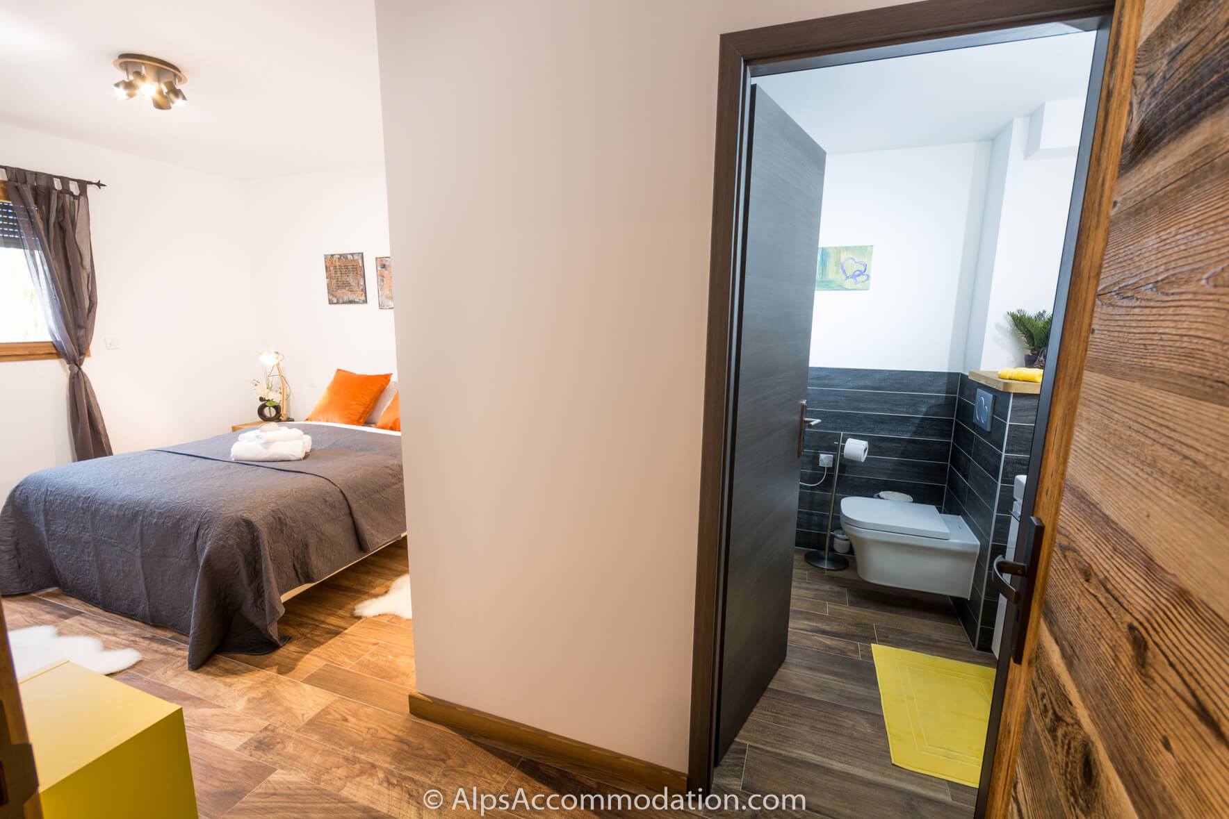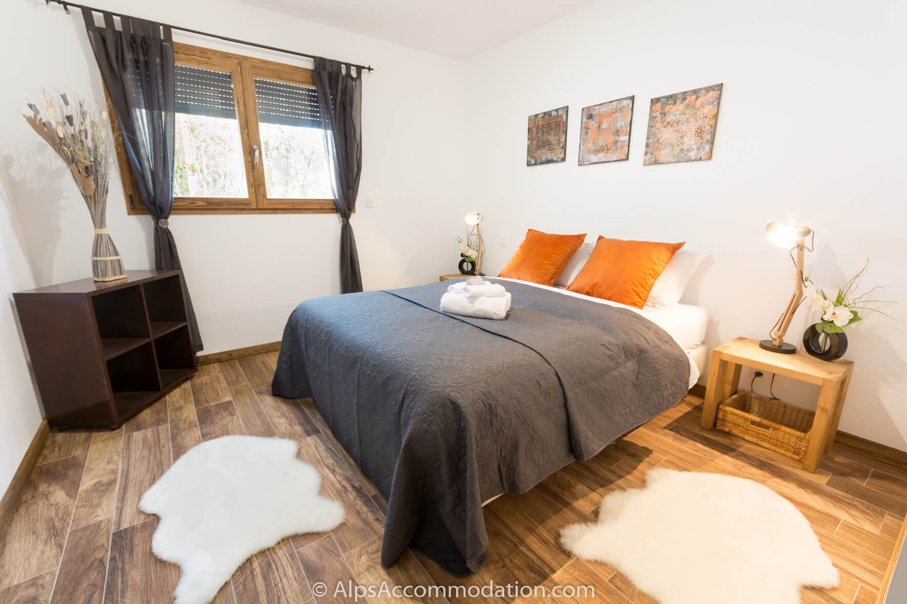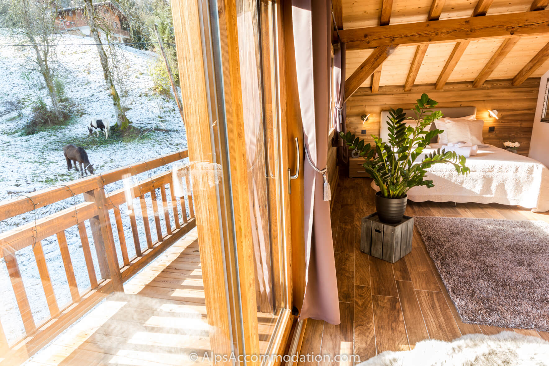 La chambre 1, chambre principale, est située à l'étage supérieur du chalet. Cette chambre spacieuse et lumineuse dispose d'un magnifique lit super King size et d'une superbe salle de bain privée avec douche à l'italienne, baignoire à remous/jacuzzi pour 2 personnes, WC et lavabo avec meuble sous vasque. Cette chambre dispose également d'un balcon privé, orienté plein sud, équipé d'une table et de chaises et d'une chaise longue.