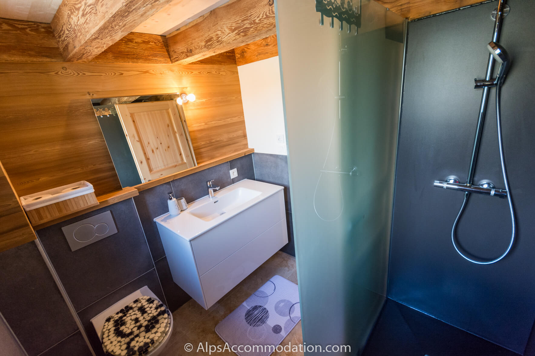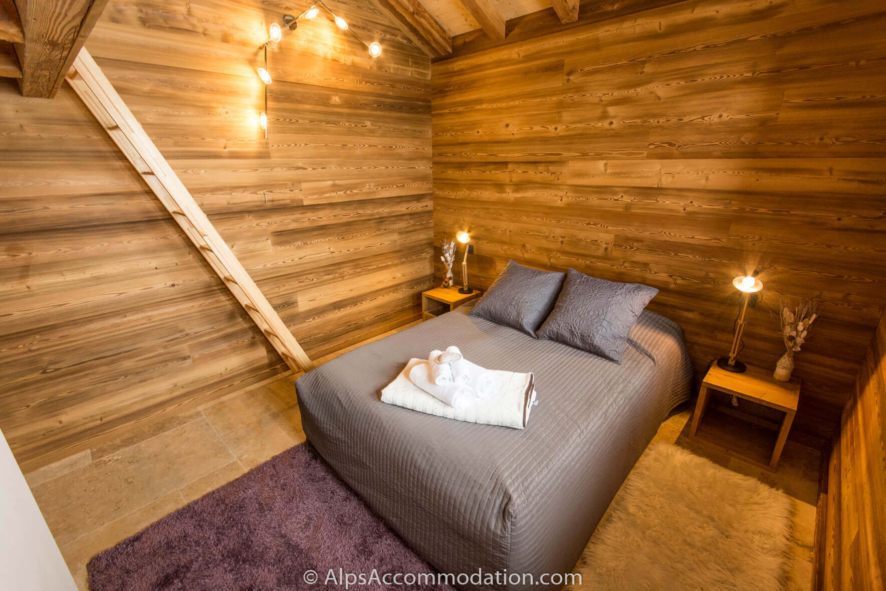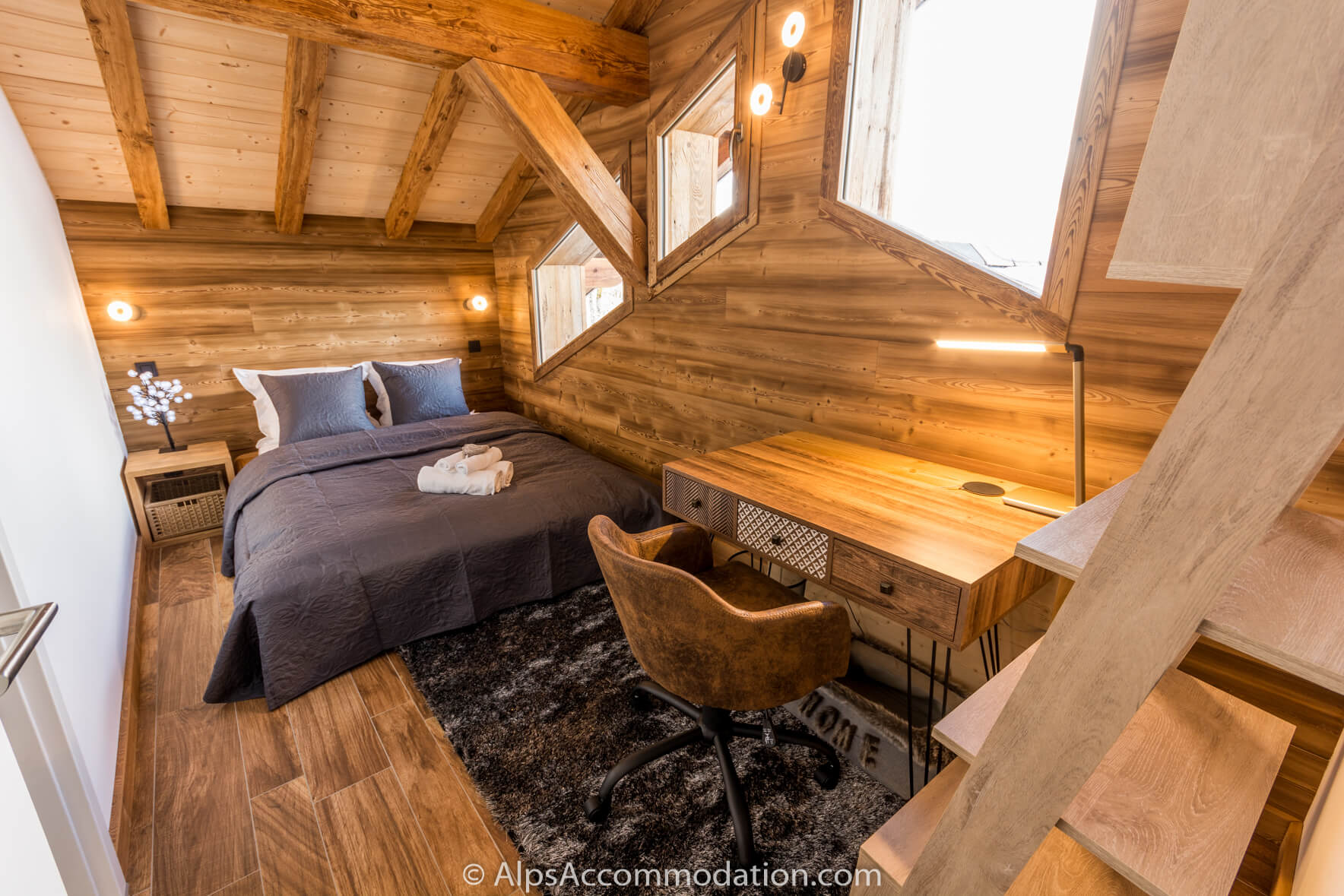 La chambre 3, une suite familiale, est située au niveau intermédiaire du chalet. Cette chambre au design astucieux dispose de deux coins couchage séparés. Vous entrez dans une chambre superking ou deux lit simples élégante avec salle de bain équipée d’une douche, d’un WC et d’un lavabo. Puis vous montez l'échelle de la mezzanine : dotée de un lit double, c'est la cachette idéale pour les enfants.
