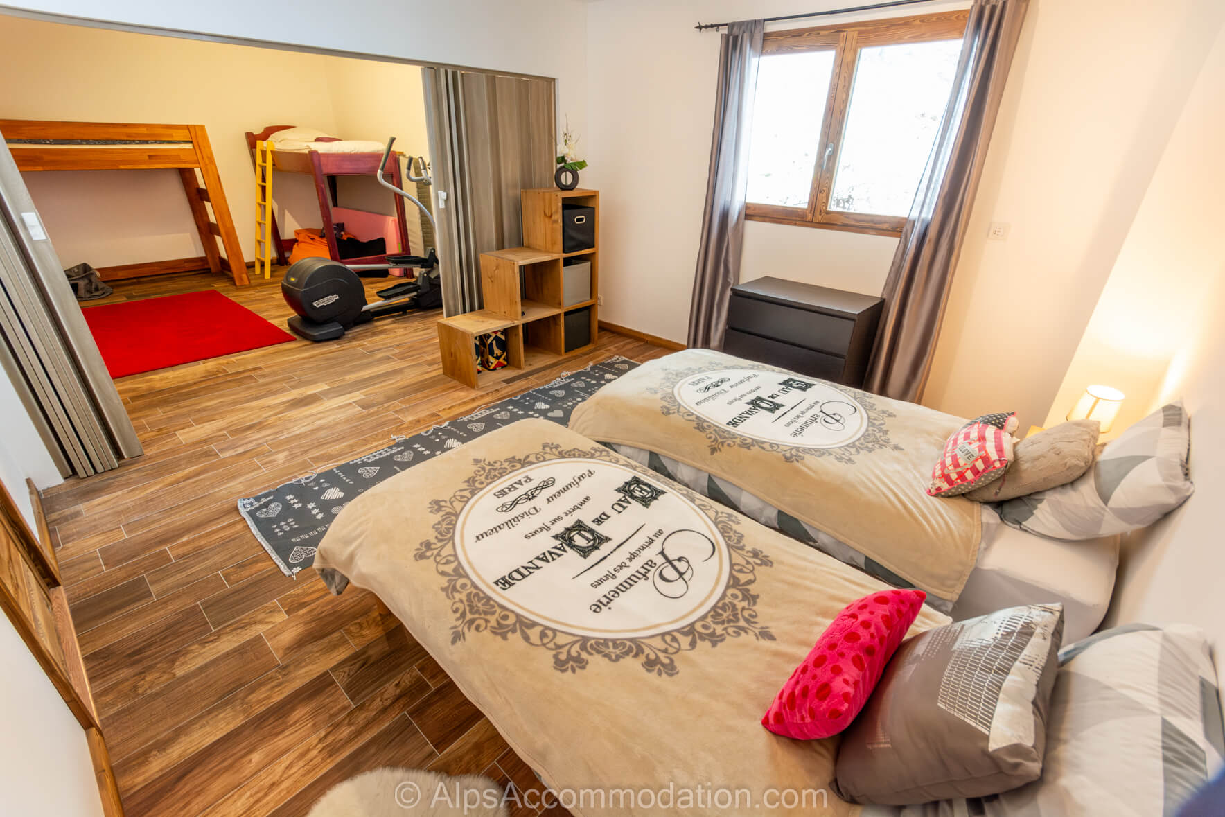 3 personnes, salle de bain partagée (douche, WC), 2x lits simples superposés en mezzanine (90cm), 1x lit futon enfant (120 cm)
