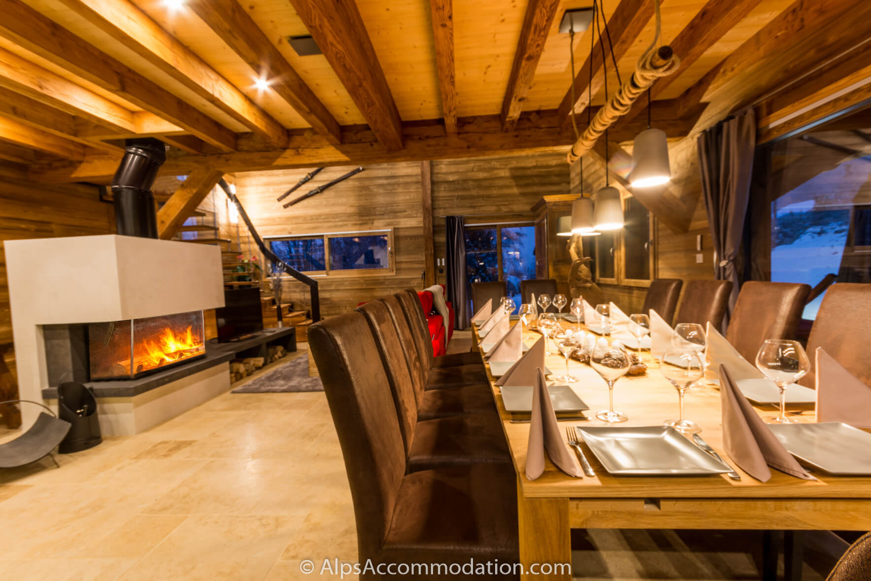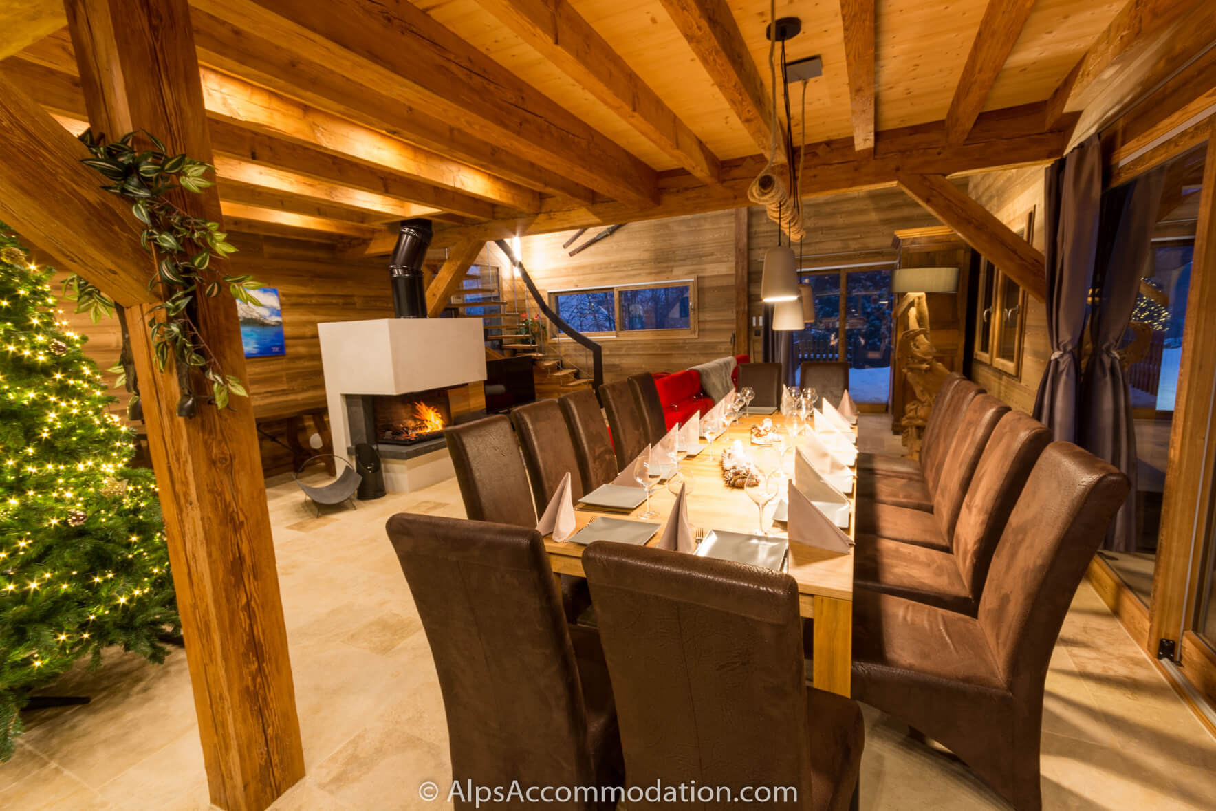 Les hauts plafonds ajoutent à la grandeur de cette pièce, et des portes coulissantes à double vitrage donnent de la clarté à l'espace et s'ouvrent sur la terrasse couverte et la pelouse soignée du chalet. Sous un superbe luminaire suspendu, une table de salle à manger en bois massif peut accueillir confortablement jusqu'à 15 personnes (12 chaises design sont installées en permanence, avec des chaises supplémentaires pour les enfants si nécessaire).