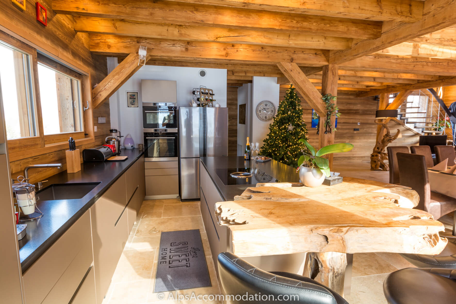 La cuisine superbement équipée fera le bonheur de tous les chefs. Elle comprend un îlot central avec plaque de cuisson à induction à 4 feux et hotte aspirante intégrée, un superbe petit bar en bois sculpté avec trois tabourets hauts, un plan de travail mural supplémentaire avec évier simple, réfrigérateur-congélateur à l'américaine, deux lave-vaisselle, four électrique traditionnel de taille standard avec fonction vapeur et four vapeur multifonctions séparé. Elle est également équipée d’une cafetière De Longhi avec moulin à café, d’un cuiseur à riz, d’une cocotte-minute, de 2 services à fondue et d’une machine à raclette traditionnelle. Vous y trouverez une large sélection de vaisselle, de verrerie et d'ustensiles, ainsi que beaucoup de rangement pour les provisions.