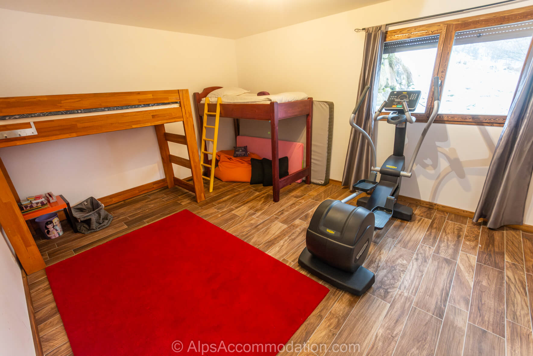 L'accès au spacieux Chalet Sole Mio se fait par l'entrée principale du rez-de-chaussée ou par une porte latérale séparée donnant directement sur le local à skis. A gauche du hall d'entrée accueillant se trouve le luxueux sauna. Un large couloir mène à trois des six chambres à coucher bien aménagées, dont deux se combinent pour créer une immense salle polyvalente de fitness ou de réunion. Deux des quatre belles salles de bains du chalet se trouvent également à ce niveau, ainsi qu'un lave-linge et un sèche-linge.