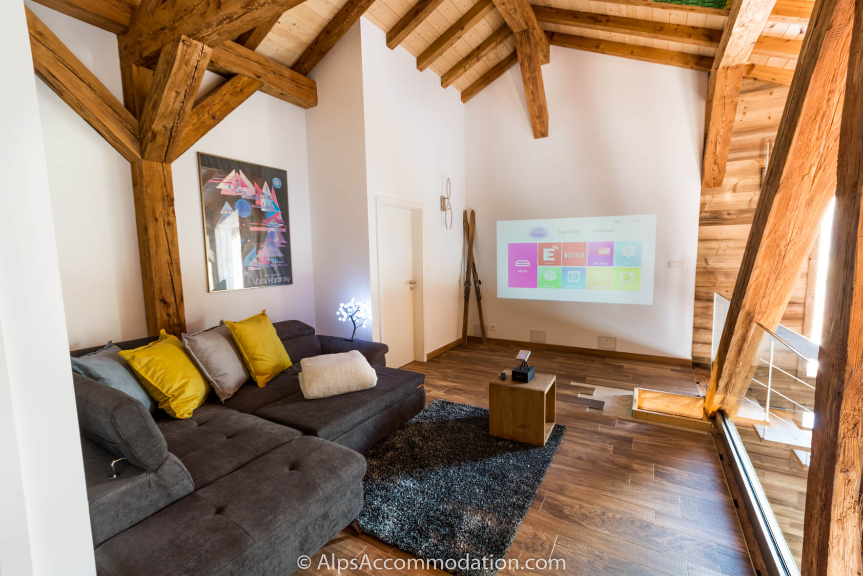 L'étage supérieur du chalet est idéal pour une famille qui souhaiterait de l’indépendance. Il se compose d'une grande chambre principale avec son propre balcon orienté au sud et salle de bain avec baignoire à remous, douche et WC. On y trouve aussi une deuxième chambre double et un deuxième salon sensationnel. Installez-vous dans l'énorme canapé d'angle (qui peut servir de canapé-lit double pour plus de flexibilité) et profitez d'un film grâce au projecteur d'écran PTV. De multiples applications, y compris Netflix, y sont préinstallées pour vous permettre de regarder vos films et séries TV préférés à grande échelle - les images sont projetées en haute qualité contre le mur blanc et propre.