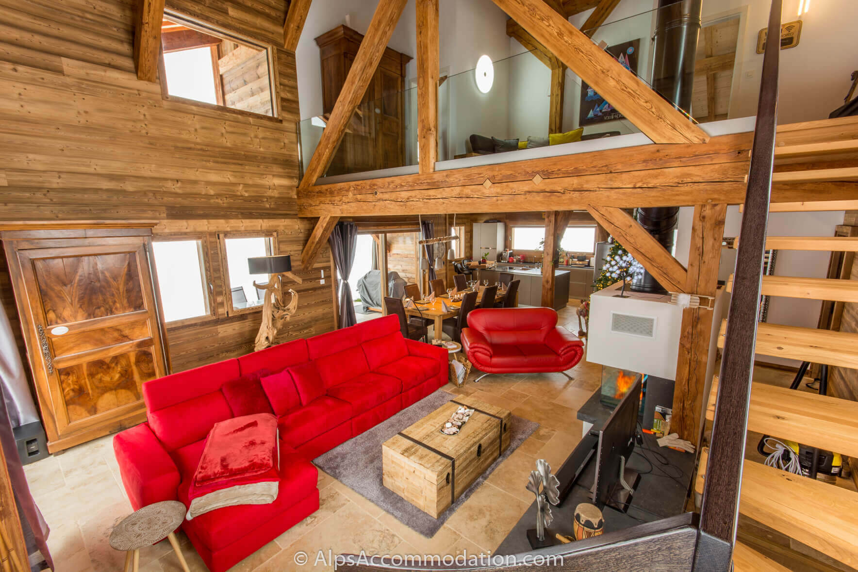 Un escalier élégant en courbe mène au niveau intermédiaire du chalet, un magnifique espace comprenant une cuisine américaine, une salle à manger et un salon. Un poêle à bois rond central et deux canapés rouge vif et profond dominent la pièce. L'inclinaison des canapés et la vue sur les sommets au sud en font l'un des meilleurs sièges de la maison. Installez-vous confortablement et profitez de la télévision française ou connectez votre propre appareil à la Smart TV Philips pour le visionnage de votre choix.
