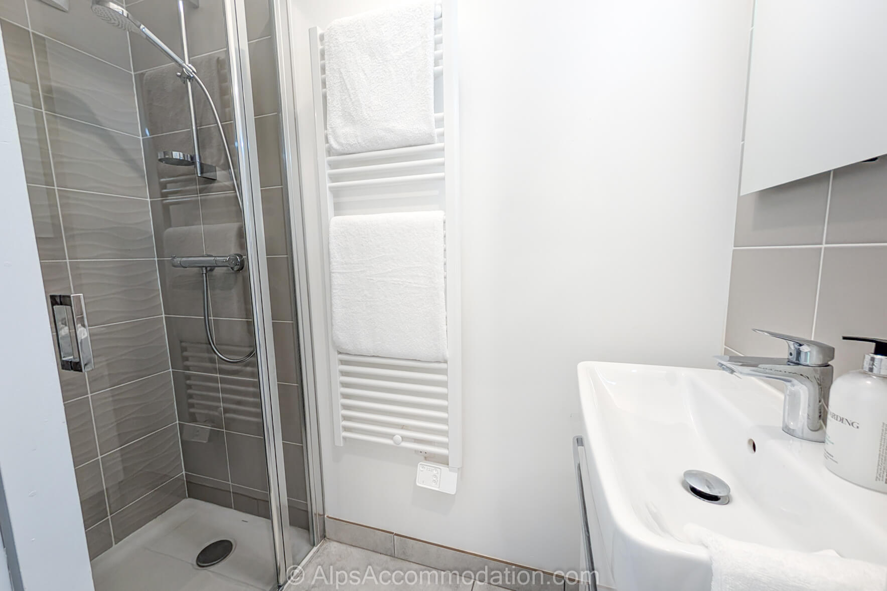 Les chambres 1 et 2 se partagent une salle de bain familiale au même niveau, avec douche, lavabo et radiateur sèche-serviettes. Un WC séparé se trouve à cet étage.