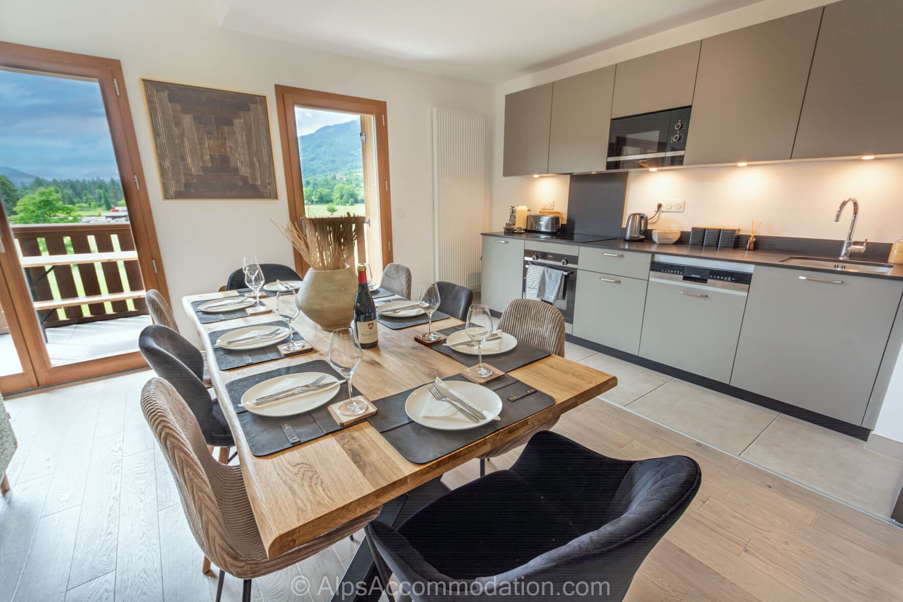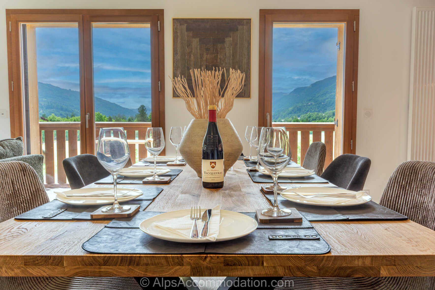 Dans la salle à manger, une table en bois massif est entourée de dix chaises élégantes. Elle est joliment disposée sur un fond de doubles portes-fenêtres qui ouvrent sur un balcon aux vues incroyables sur la vallée et les montagnes environnantes.