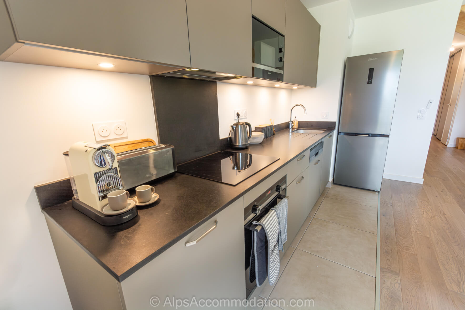 La cuisine moderne est entièrement équipée et comprend un four électrique, une plaque de cuisson, un four à micro-ondes, un réfrigérateur-congélateur, un lave-vaisselle et une machine à café Nespresso. De nombreux rangements et ustensiles de cuisine de qualité permettent de préparer d’excellents repas.