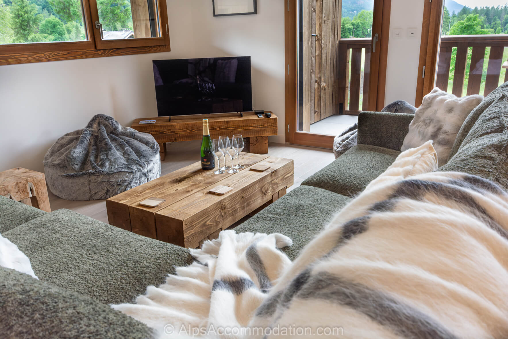 Le salon comprend un immense canapé confortable et des poufs géants, disposés autour d'une table basse en bois. Une smart-TV, une connexion Wi-Fi et des jeux de société permettent de passer des soirées agréables en famille ou entre amis.