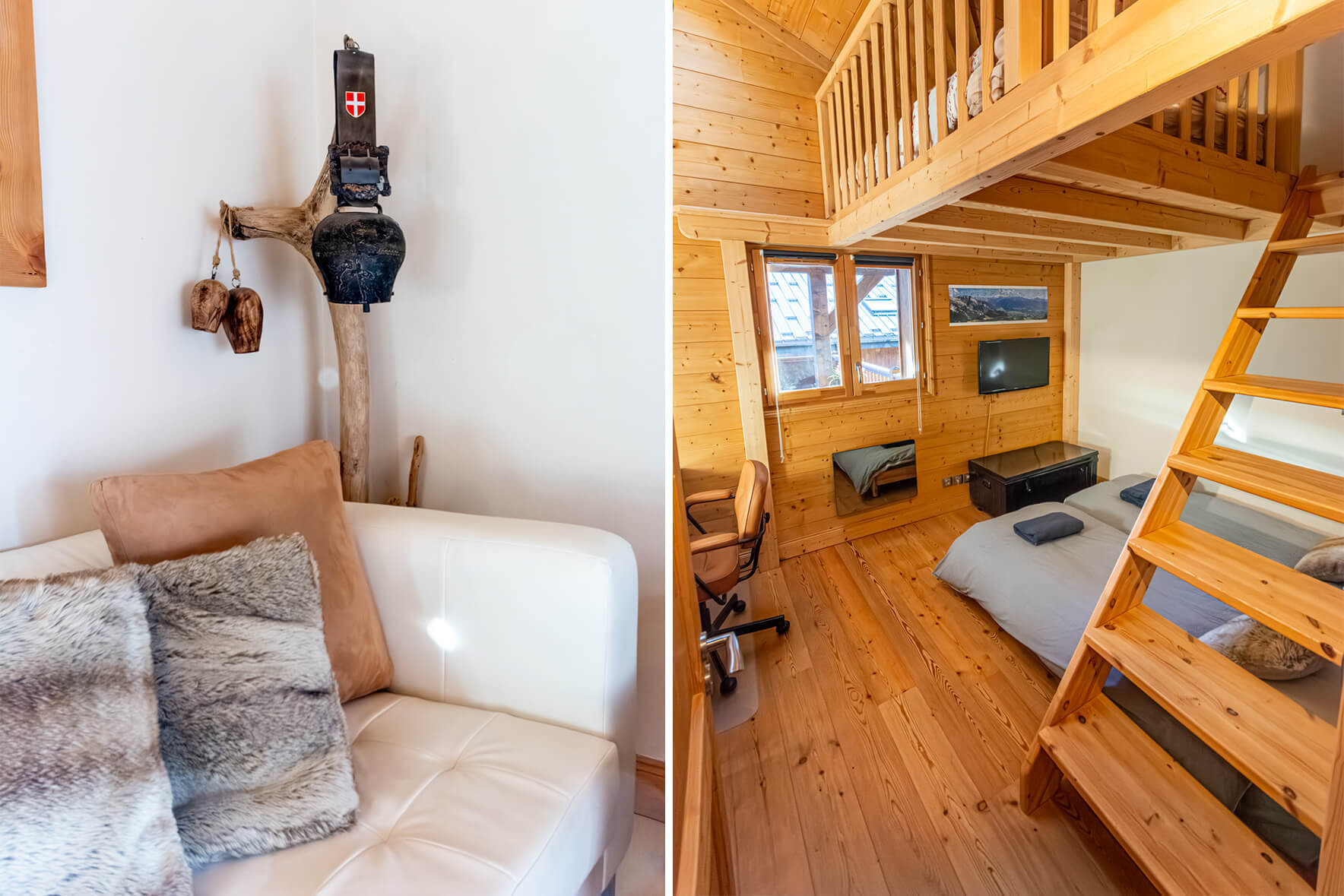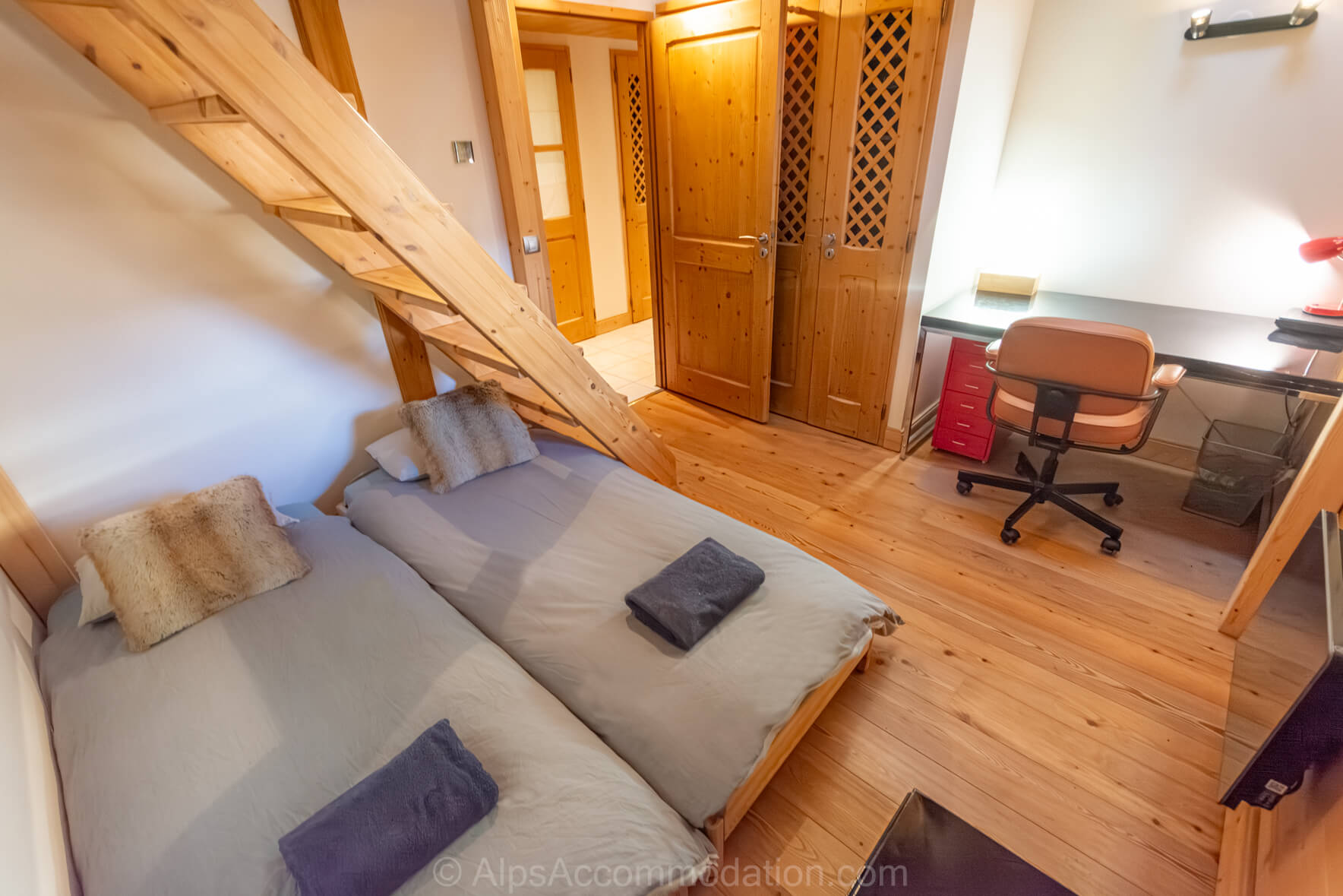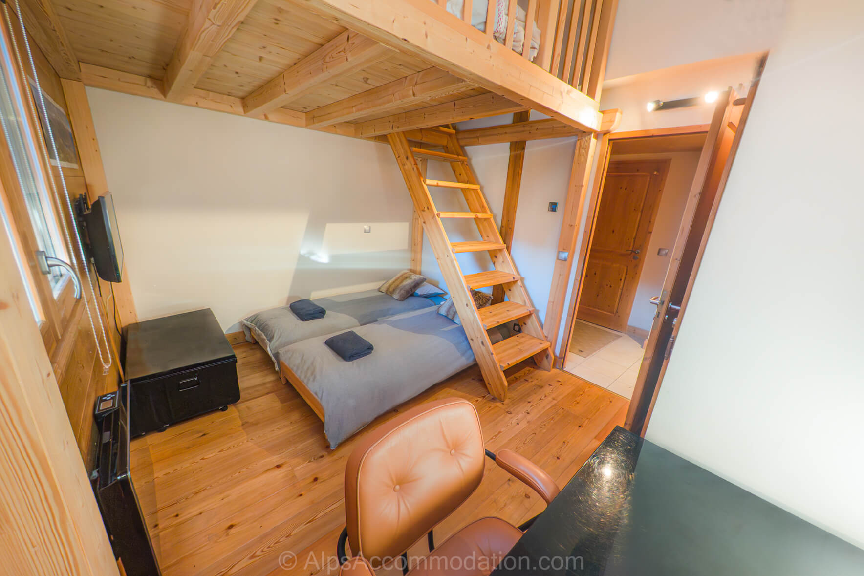 La chambre 2 propose un agencement original en mezzanine sur deux niveaux, pouvant accueillir jusqu’à quatre personnes. Le niveau inférieur dispose de deux lits simples, tandis qu’un escalier mène au niveau supérieur où se trouve un lit double. Une grande armoire, ainsi qu’un bureau avec chaise, complètent cet espace polyvalent.