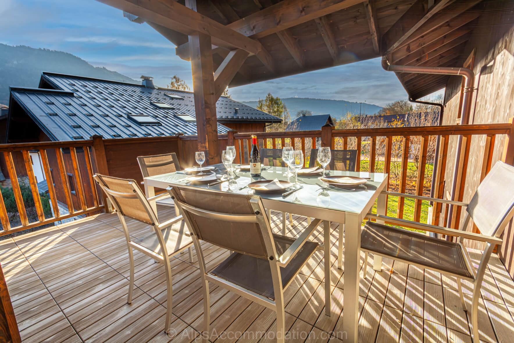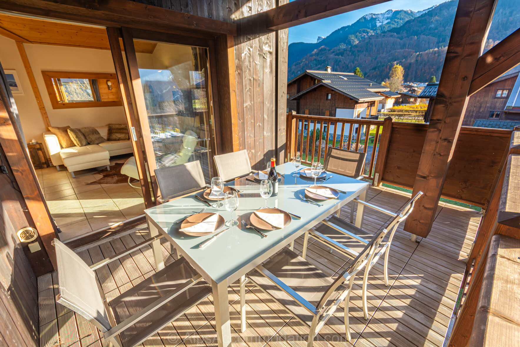 Un balcon couvert prolonge agréablement l’espace de vie vers l’extérieur, offrant une vue sur les sommets environnants et les pistes du Grand Massif. Équipé d’une table et de chaises, il constitue le cadre parfait pour partager des repas ou profiter de moments de détente en famille ou entre amis.