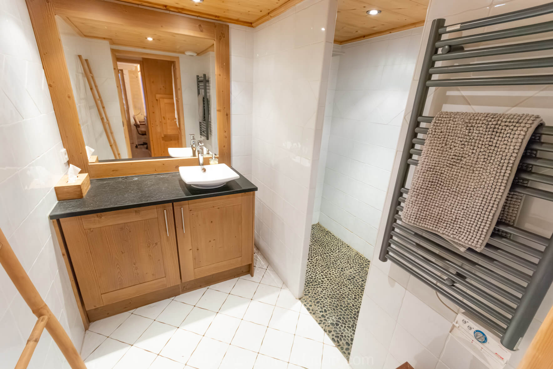 Une grande salle de bain familiale est également disponible, avec douche à l’italienne, meuble vasque et sèche-serviettes. Un WC séparé complète l’aménagement.