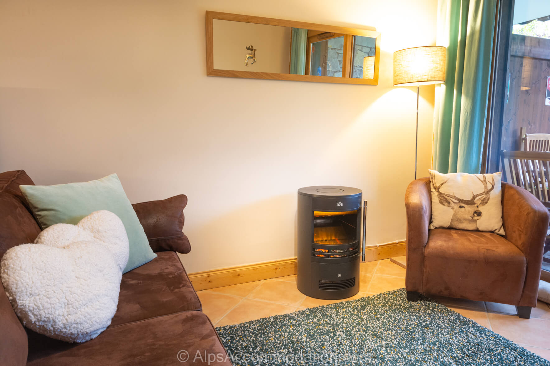 L’espace salon comprend un grand canopé et un fauteuil, très confortables. Après une journée d’activité vous pouvez vous détendre avec des amis ou votre famille devant le poêle à bois électrique et la télévision connectée. Une deuxième télévision et un lecteur DVD se trouvent dans la deuxième chambre. Il y a un grand choix des livres et jeux de societé aussi disponibles. A cet appartement exceptionel, le WiFi est installé partout - ce service est gratuit pour nos clients. L’appartement est equipé avec un connexion Ipod. Il ne faut pas oublier les vues extraordinaires du salon vers les jardins cultivés du développement, et, au loin, des fermes et des montagnes, le cadre naturel et magnifique de cet village historique. Nouveauté pour l'hiver 2023/24 : une cheminée électrique, qui ajoute au luxe de l'appartement !
