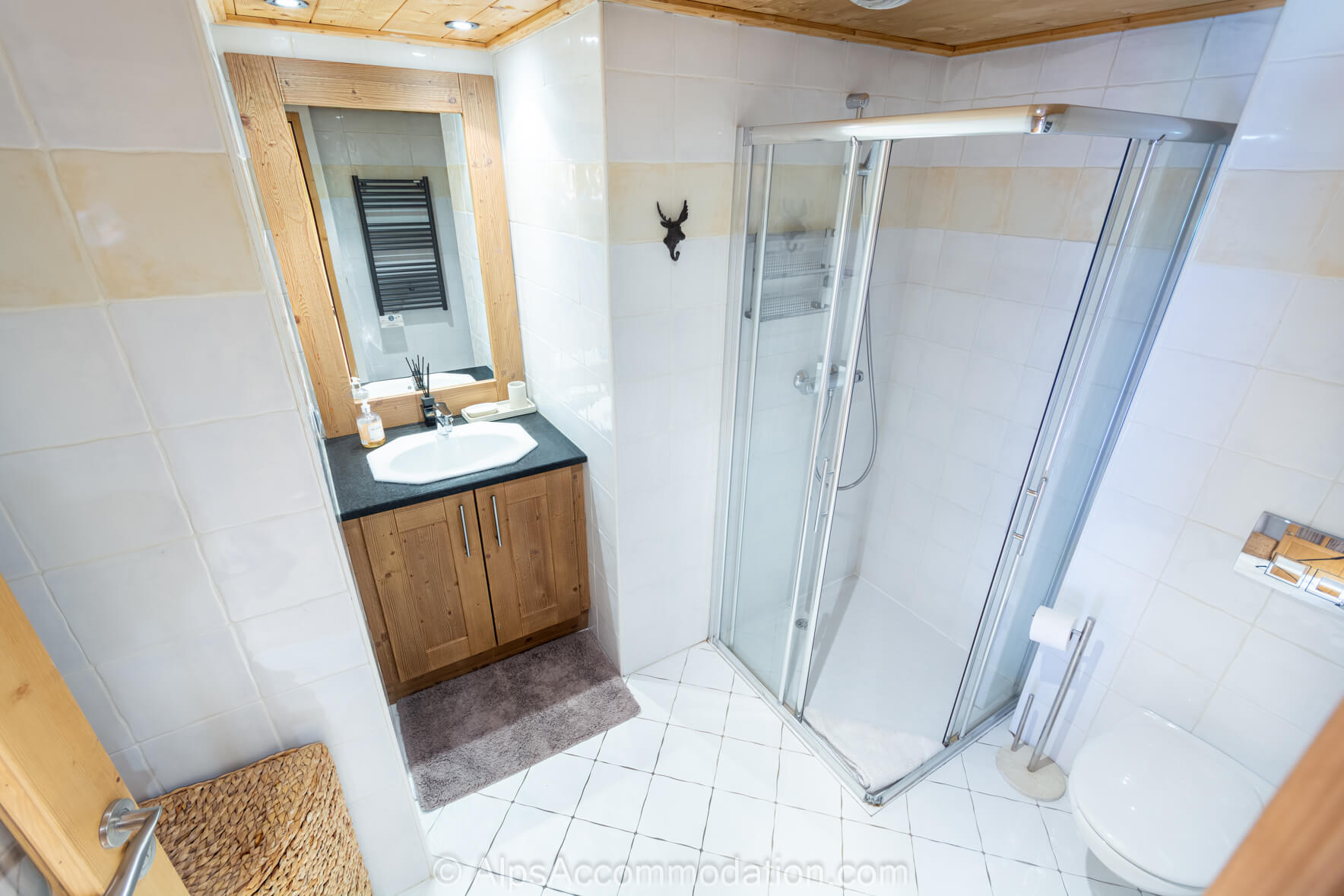 En face de la chambre 1 se trouve une salle de bain familiale avec douche, meuble vasque, sèche-serviettes et WC.