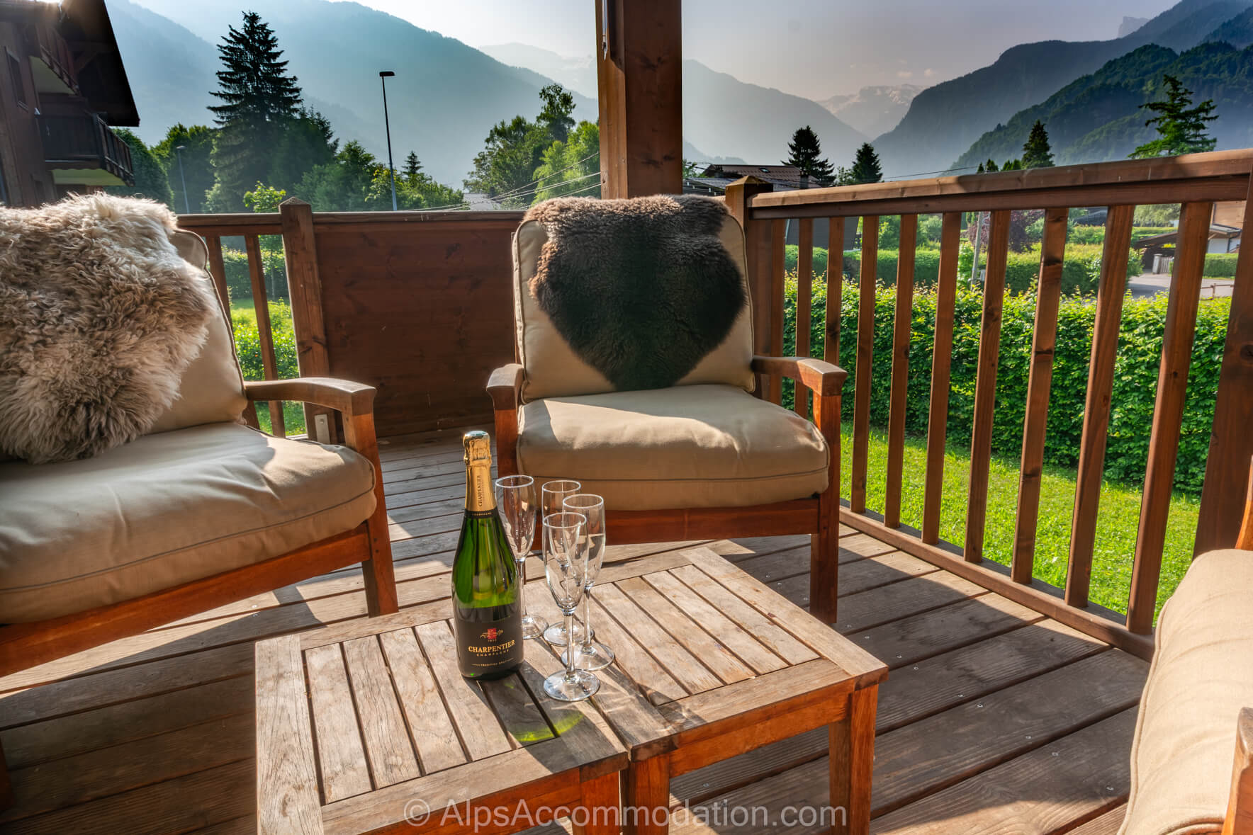 Deux balcons exposés plein sud offrent un espace paisible pour profiter des vues panoramiques sur les montagnes environnantes et du soleil tout au long de la journée. Le mobilier extérieur crée le cadre idéal pour le café matinal ou pour se détendre à l’heure de l’apéritif en admirant le paysage alpin.