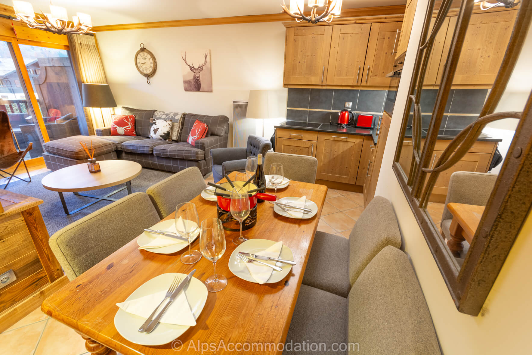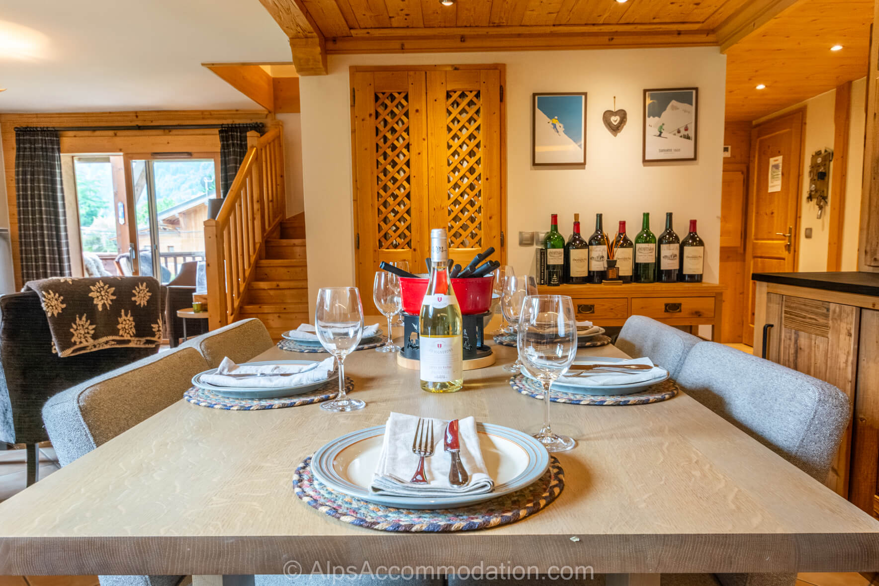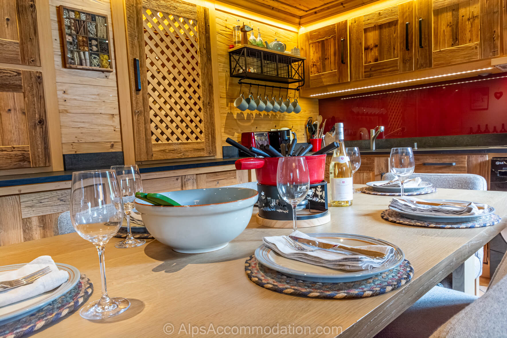 Les deux salles à manger sont meublées de magnifiques tables en bois et de chaises confortables rembourrées, idéales pour partager un repas ou jouer le soir. Les deux cuisines entièrement équipées disposent de tout le nécessaire, notamment lave-vaisselle, réfrigérateurs/congélateurs, machines à café Nespresso et, bien sûr, les indispensables appareils à fondue.