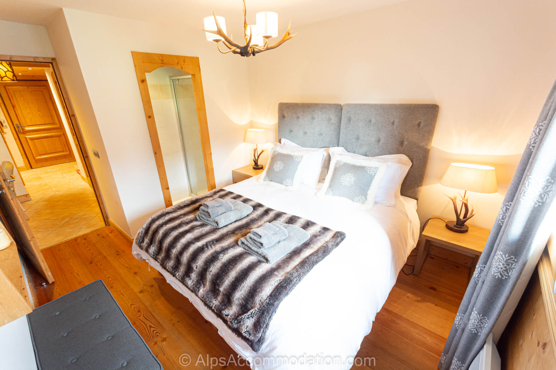 La chambre 4 est une impressionnante suite parentale avec un grand lit super king-size (pouvant également être aménagé en lits simples sur demande). La salle de bain attenante comprend une douche, un meuble vasque et un miroir. Une armoire intégrée offre un bel espace de rangement.