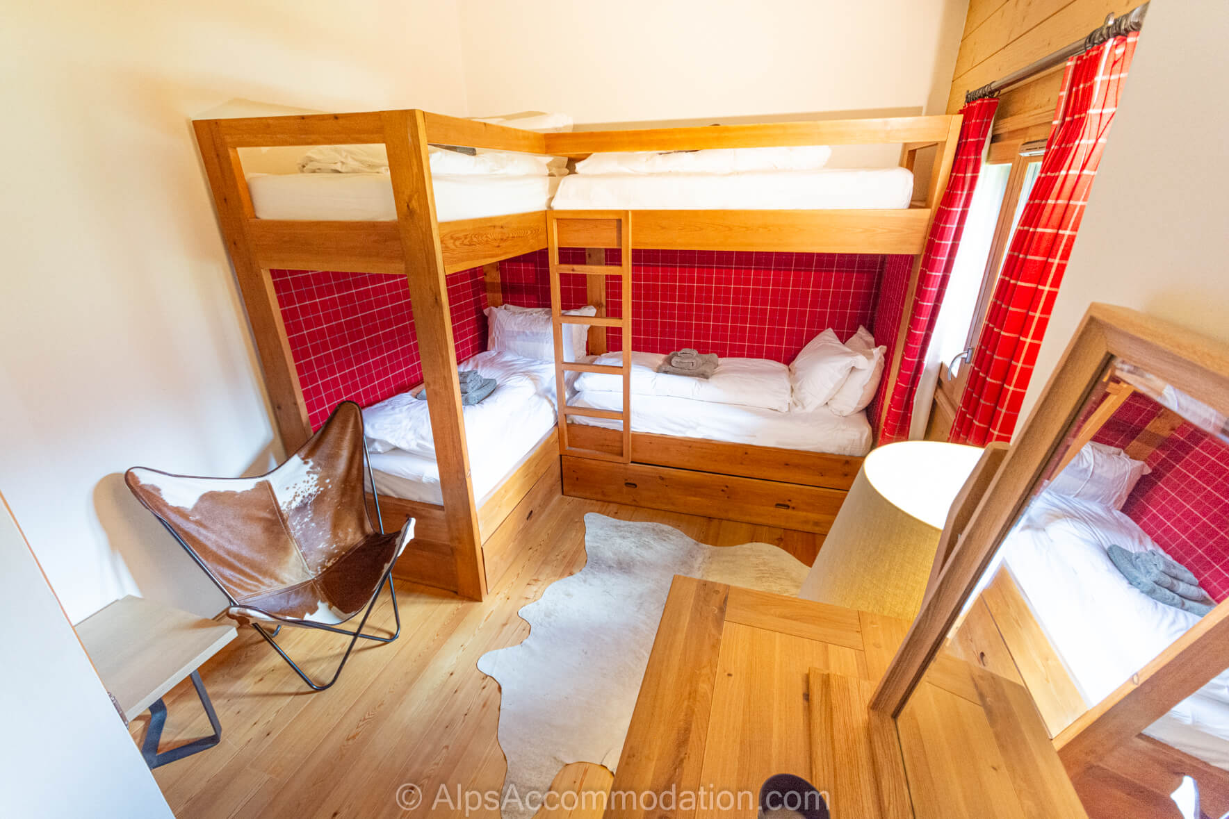 La chambre 5 est une chambre quadruple avec deux ensembles de lits superposés de taille standard. Un cinquième lit gigogne offre une flexibilité supplémentaire. Une armoire intégrée et une commode assurent de nombreux rangements.