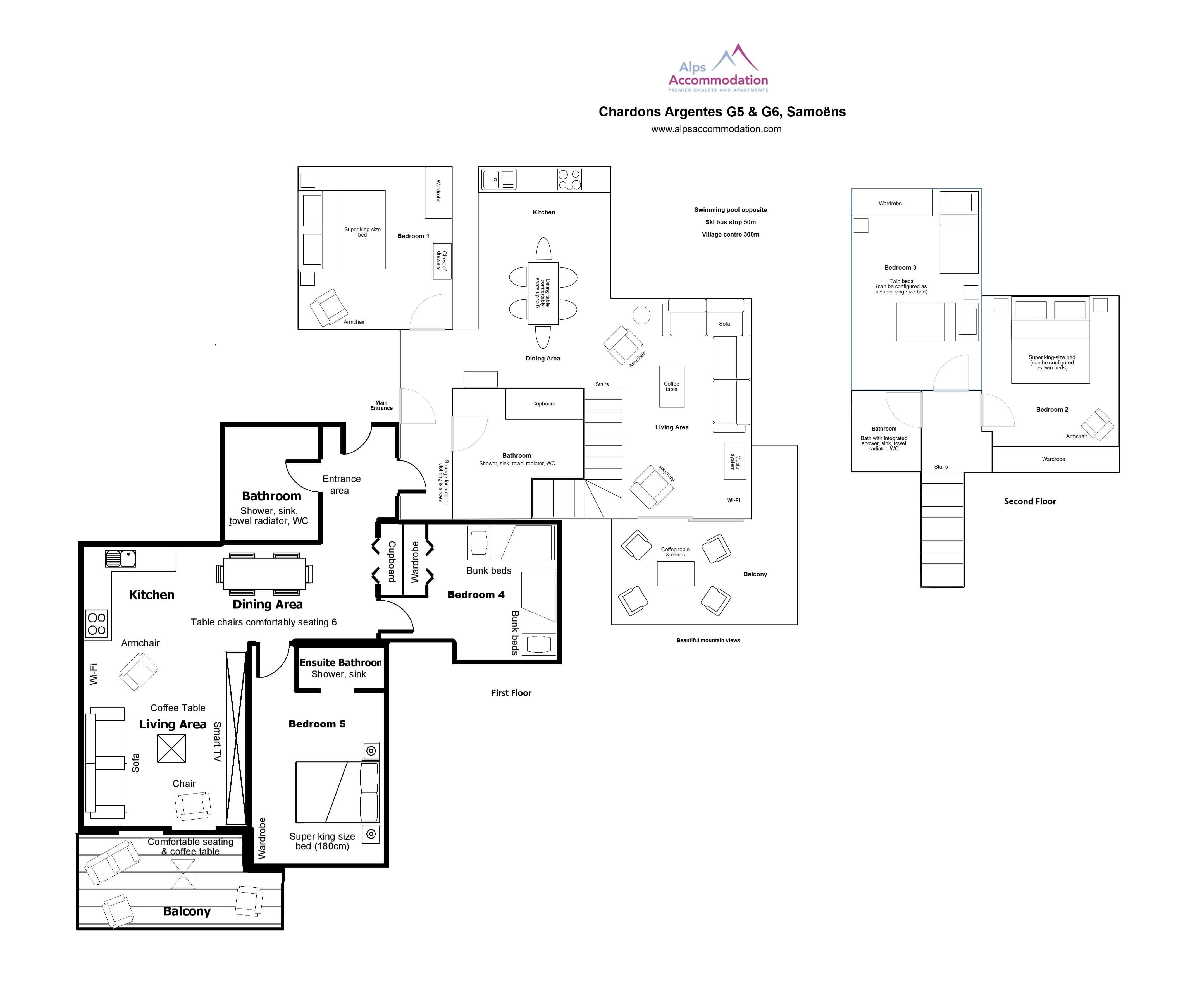 Chardons Argentés G5 & G6 est un superbe appartement duplex de 5 chambres et 4 salles de bain, pouvant accueillir jusqu’à 12 personnes sur deux niveaux. Issu de la fusion de deux appartements adjacents reliés par une porte intérieure, il offre un espace généreux et une flexibilité exceptionnelle, avec le luxe d’une piscine intérieure réservée aux résidents.