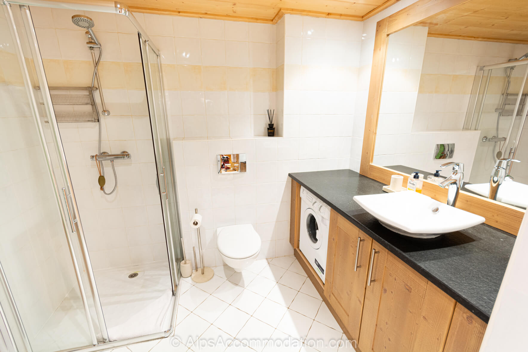 En face de la chambre 5, une grande salle de bain familiale dispose d’une douche, d’un meuble vasque avec grand miroir, d’un sèche-serviettes et de WC. Un lave-linge se trouve également dans cette salle de bain.