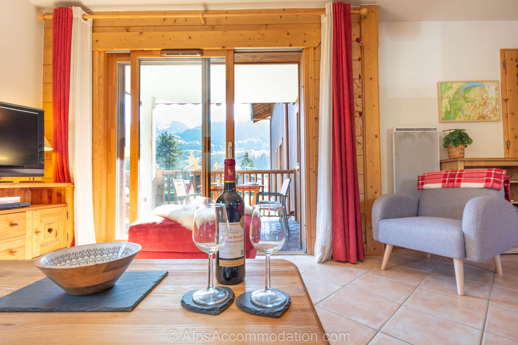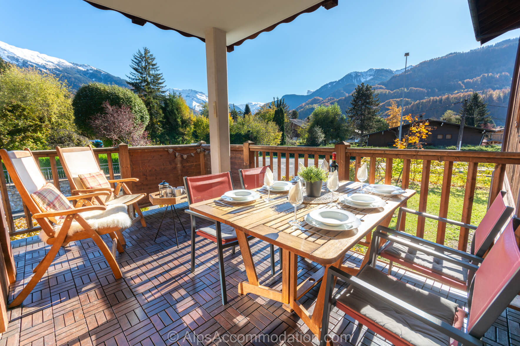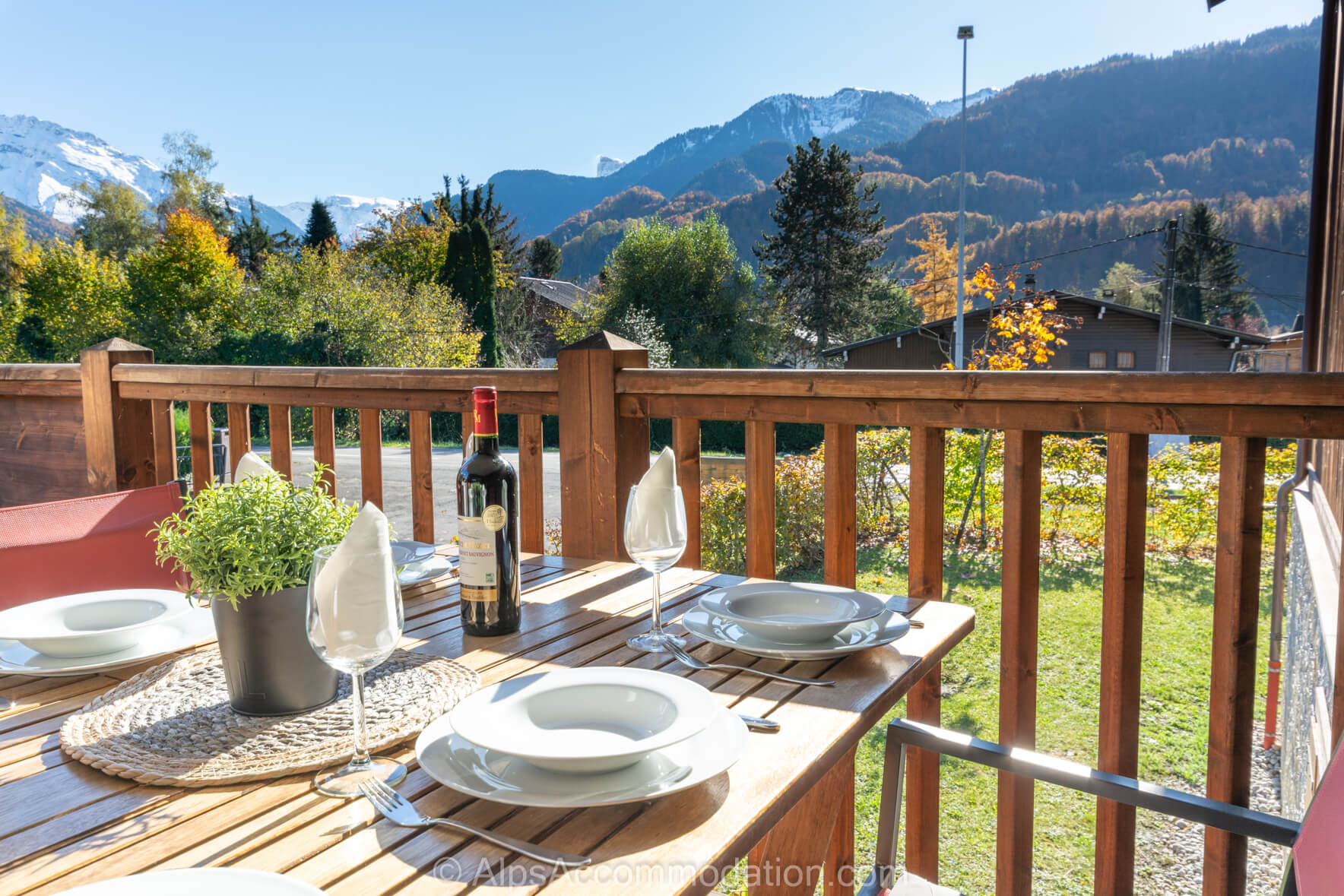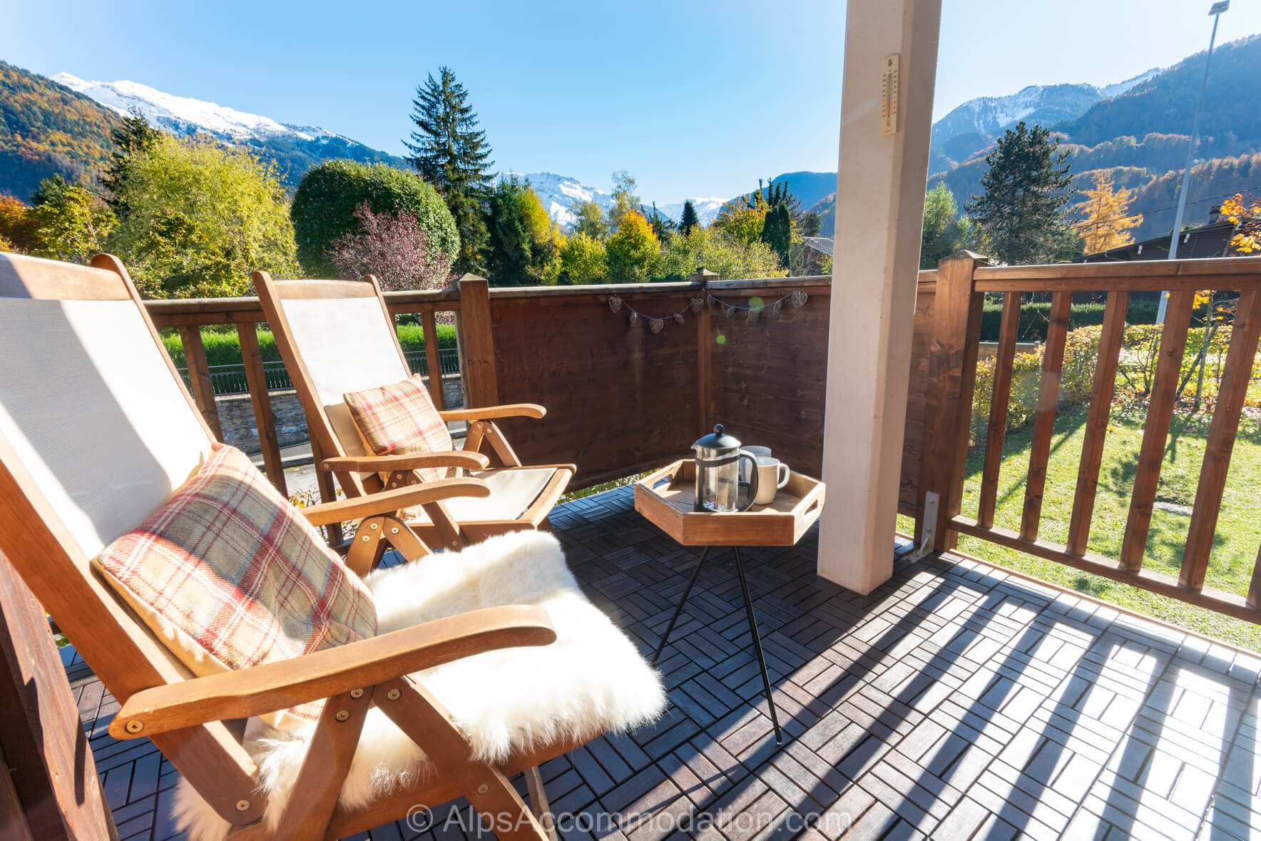 Chardons Argentés H8 dispose d'un grand balcon exposé au sud de 12 m² bénéficiant d'un emplacement privilégié à l'angle de la résidence et offrant une vue imprenable de l'emblématique montagne du Criou jusqu'aux imposantes montagnes au-dessus de Sixt et en direction du domaine skiable du Grand Massif. Il est équipé d'une table et de chaises d’extérieurs, idéal pour les repas en plein air et pour profiter du cadre.