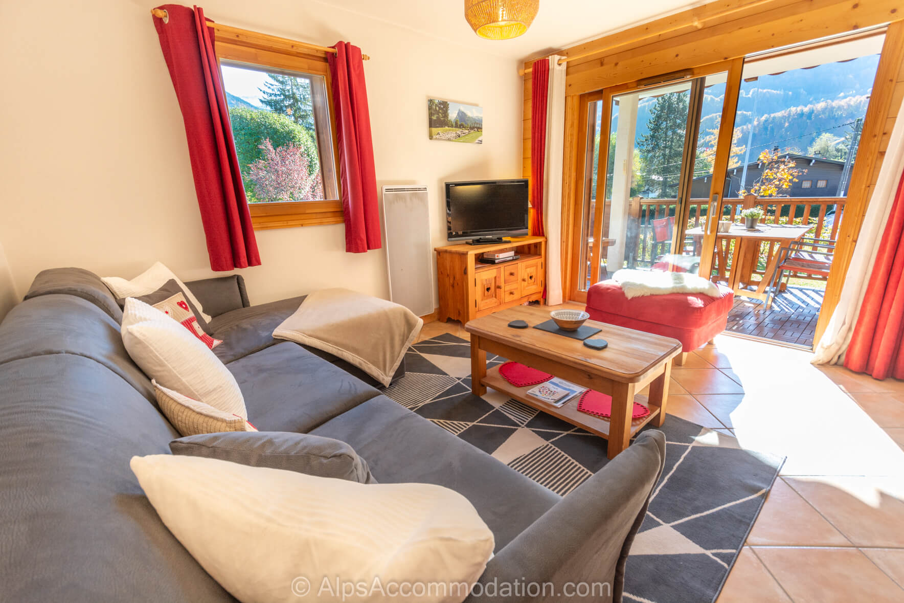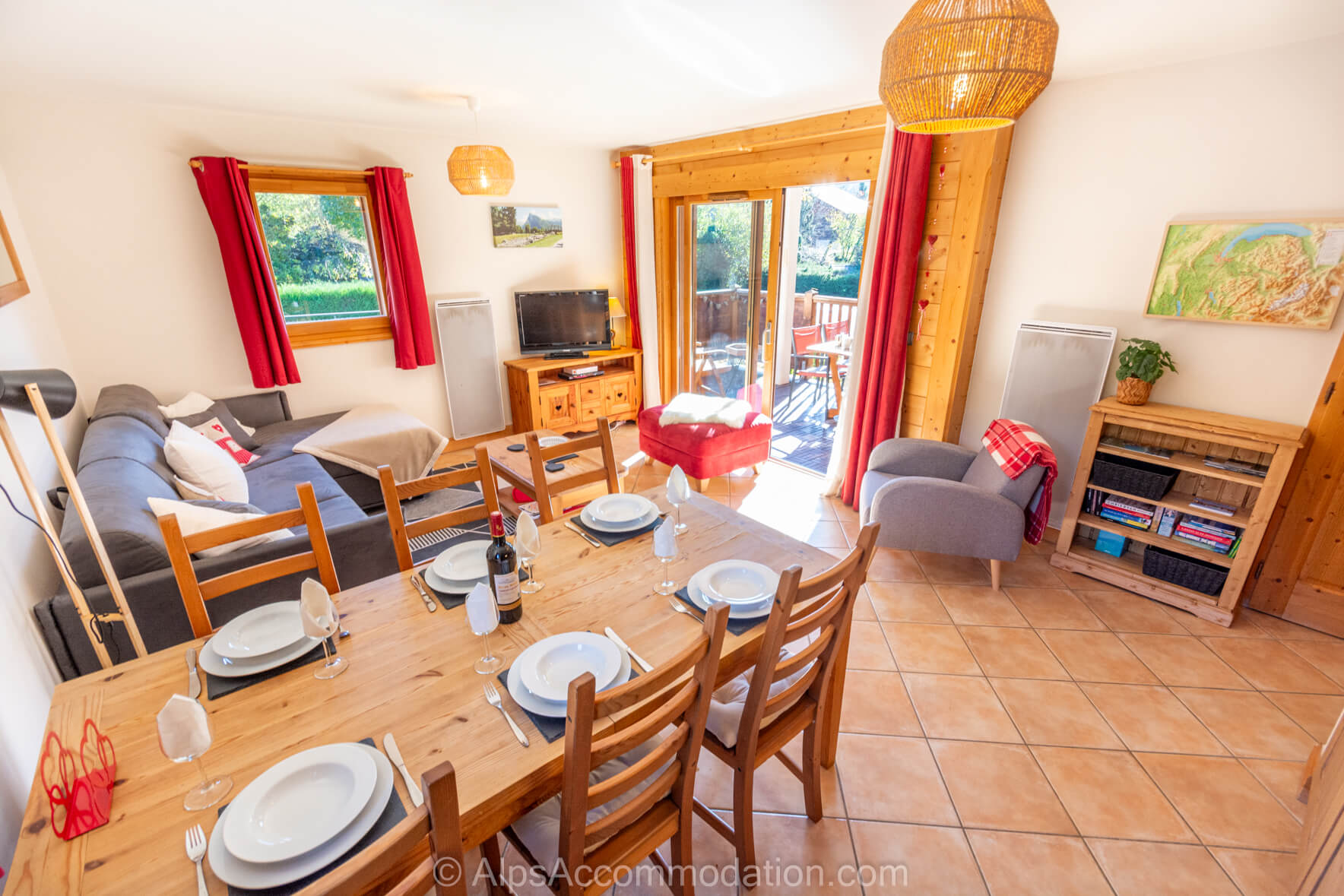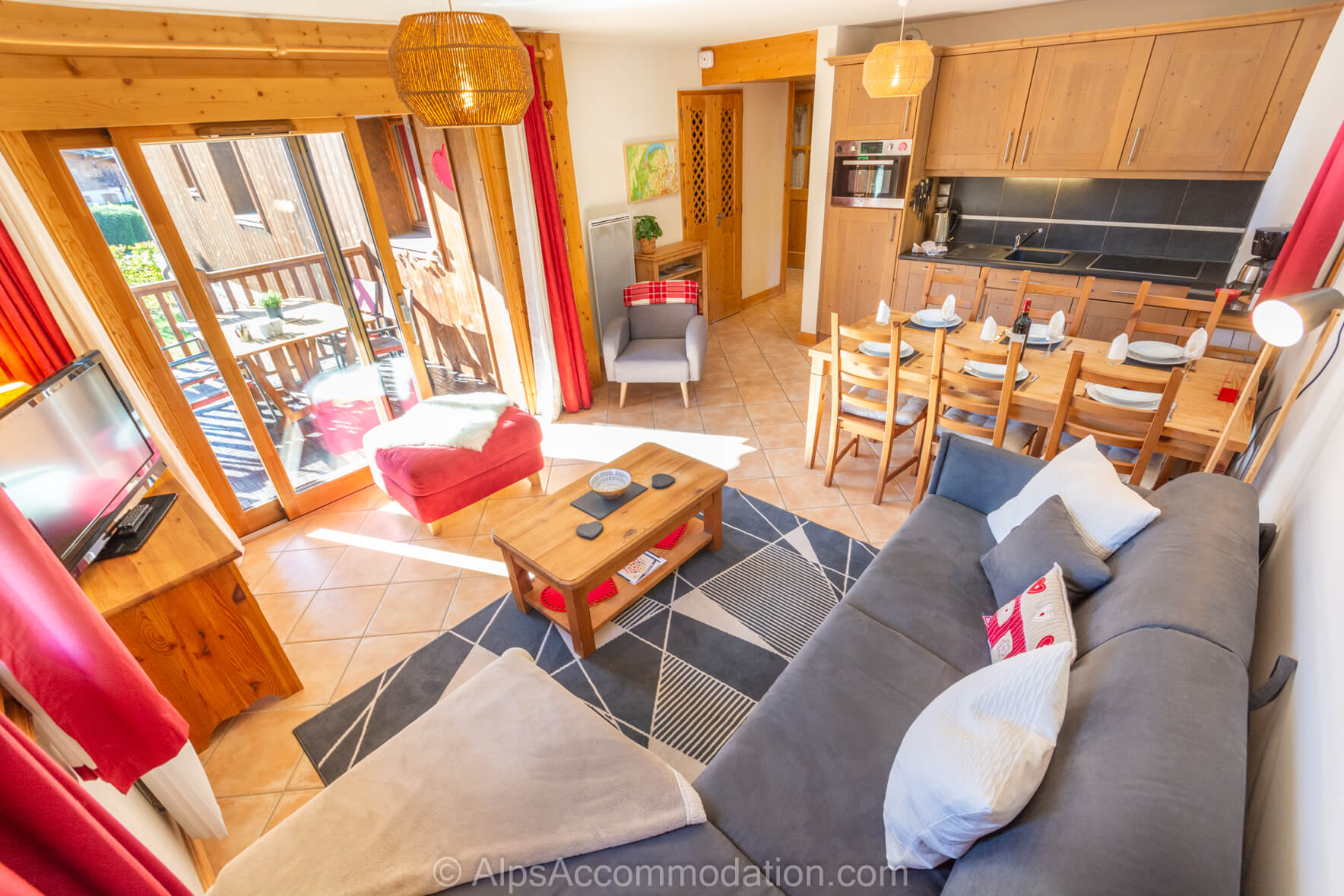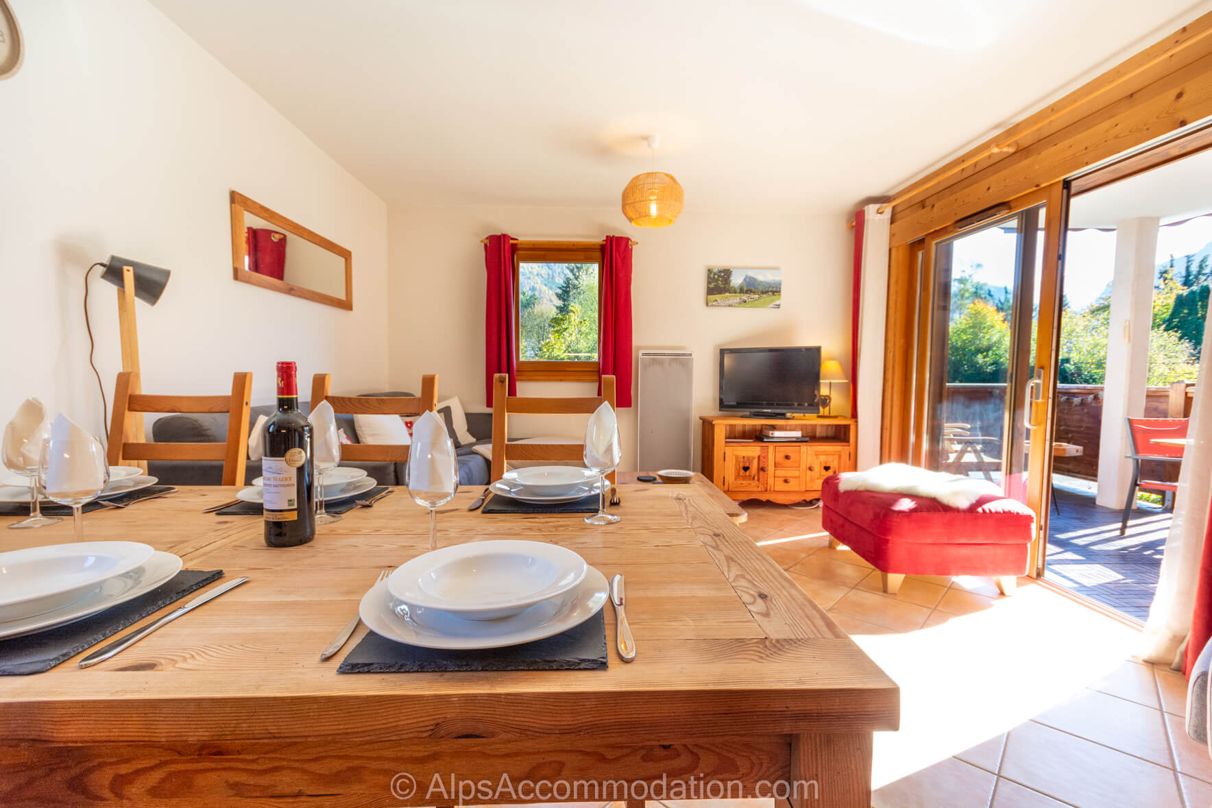 Chardons Argentés H8 dispose d'un grand balcon exposé au sud de 12 m² bénéficiant d'un emplacement privilégié à l'angle de la résidence et offrant une vue imprenable de l'emblématique montagne du Criou jusqu'aux imposantes montagnes au-dessus de Sixt et en direction du domaine skiable du Grand Massif. Il est équipé d'une table et de chaises d’extérieurs, idéal pour les repas en plein air et pour profiter du cadre.