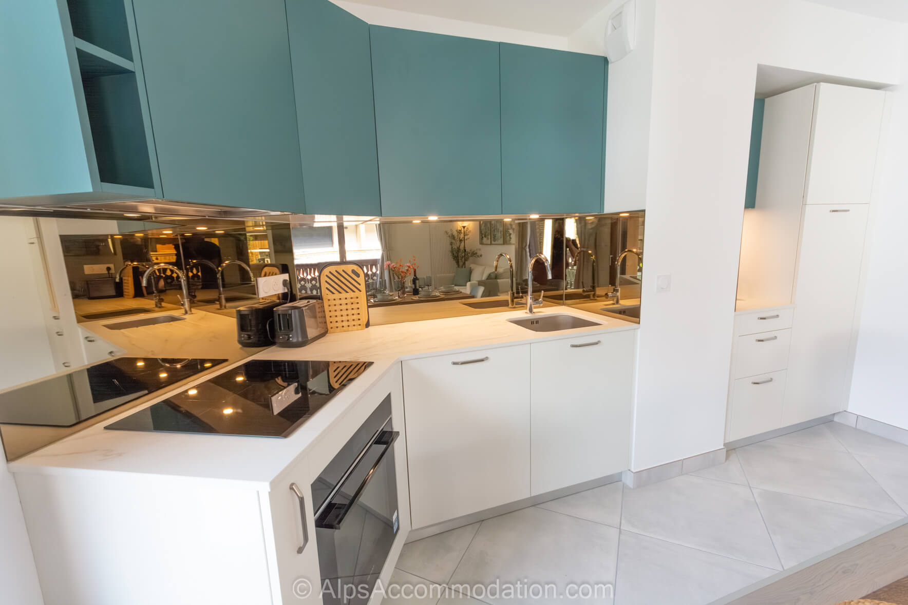 La cuisine moderne, entièrement équipée, comprend un four électrique, une plaque à induction, un micro-ondes, un réfrigérateur-congélateur, un lave-vaisselle et une machine à café Nespresso. Une crédence effet miroir et des ustensiles de qualité garantissent tout le nécessaire pour préparer de délicieux repas faits maison.