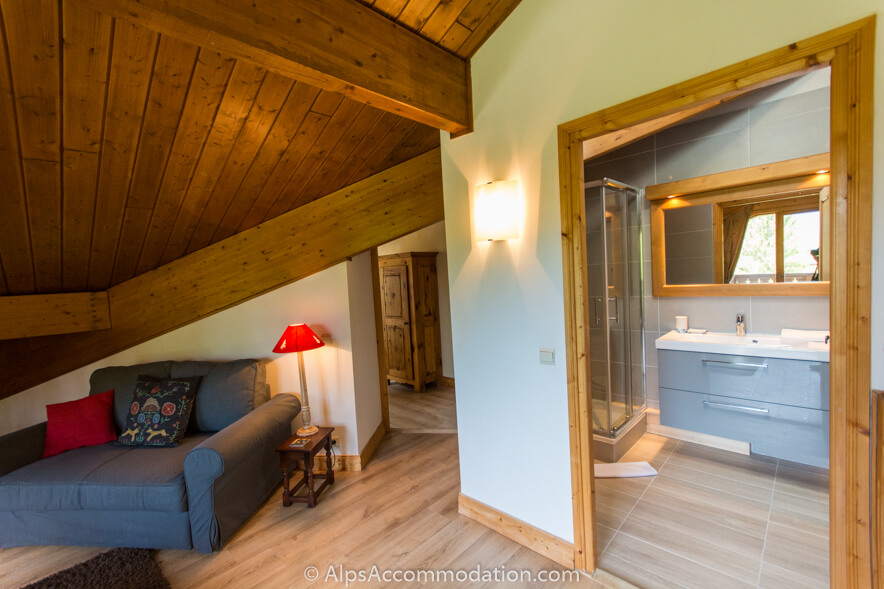 Un escalier ascend au salon épatant. Le salon possede les sieges confortables, un canapé-lit inclus, et deux autre canapés, extrêmement confortable. Il est aussi fourni avec TV écran plat, PlayStation 4, des jeux, et connexion WiFI. Du salon, on peut admirer le grand jardin du residence, et, au l’arrière plan, les vues spectaculaires aux montagnes. Aussi a ce niveu est la troisieme chambre et en face les clients trouveront une salle de bains avec douche, un évier, un WC et un radiateur à serviette.