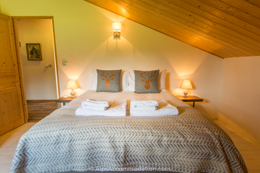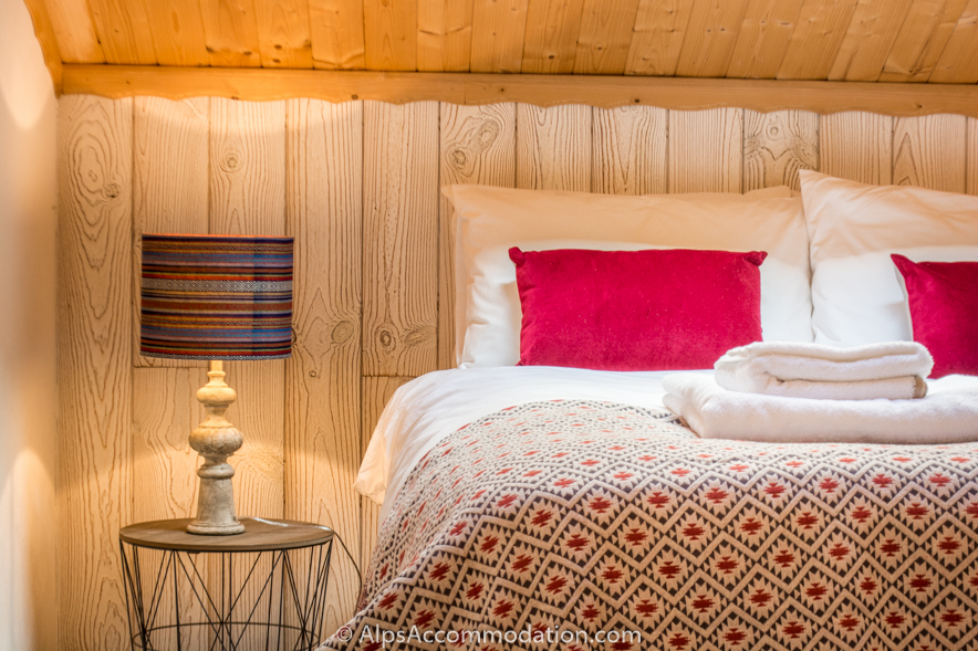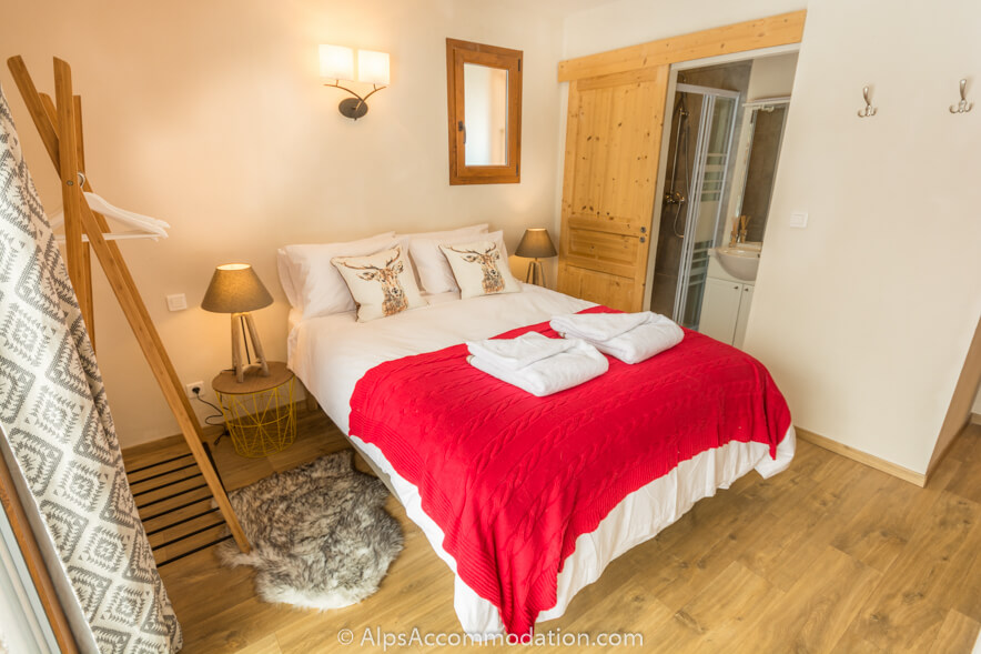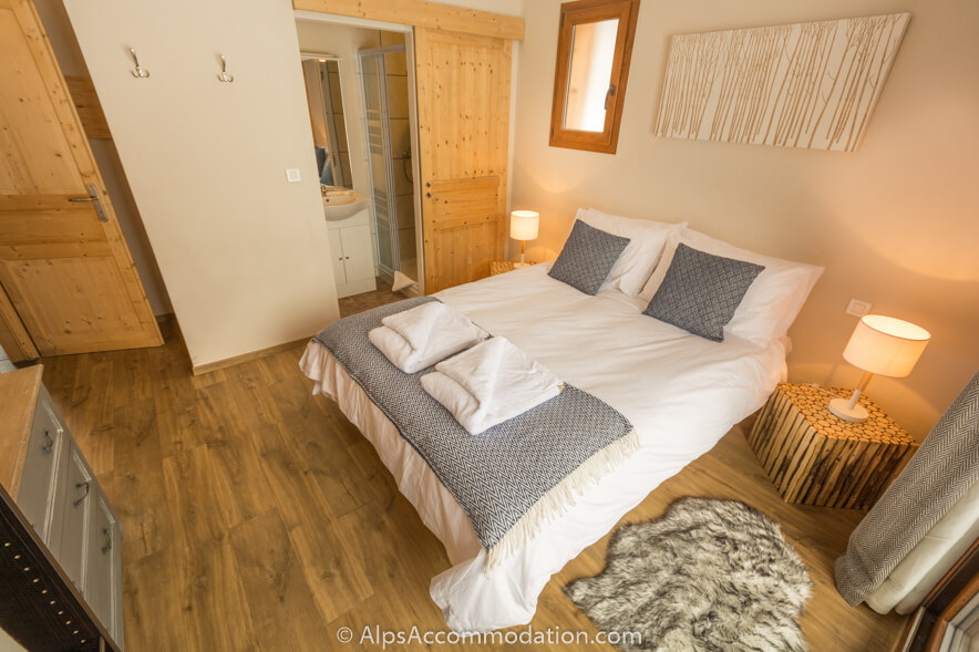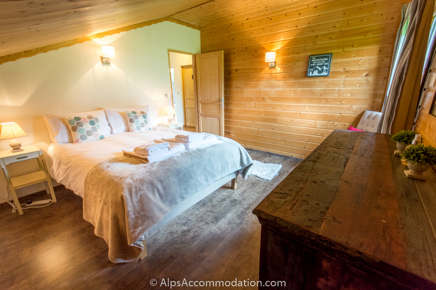 La chambre 1 est une imposante chambre double (peut être configuré en lits jumeaux sur demande) avec salle de bain. Offrant une vue sur les vastes terrains agricoles jusqu’aux majestueux pics enneigés, cette pièce a un effet très reposant. La jolie couverture tressée et le tableau sculpté ajoutent une touche charmante. La salle de bain privative comprend une douche, un meuble-lavabo et un WC. Une armoire et commode fournissent un bon espace de rangement.